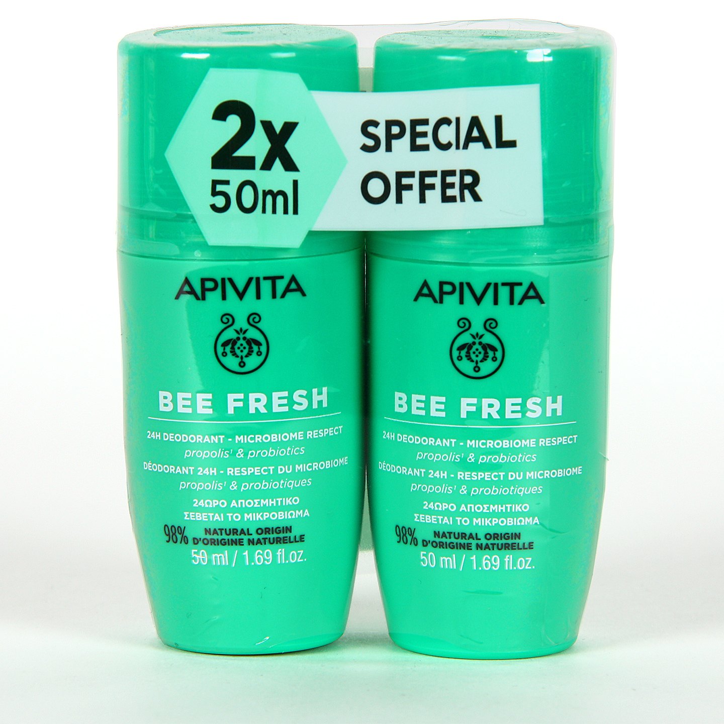 Pack Duplo Apivita Bee Fresh Desodorante 24h es un cuidado que ofrece una protección antiolor, respetando la transpiración para una sensación duradera de frescor y comodidad durante todo el día. Este cuidado, que está indicado para hombres y mujeres, está formulado con ingredientes naturales y sin sales aluminio ni alcohol. Pack con dos unidades de Apivita Bee Fresh Desodorante 50 ml.