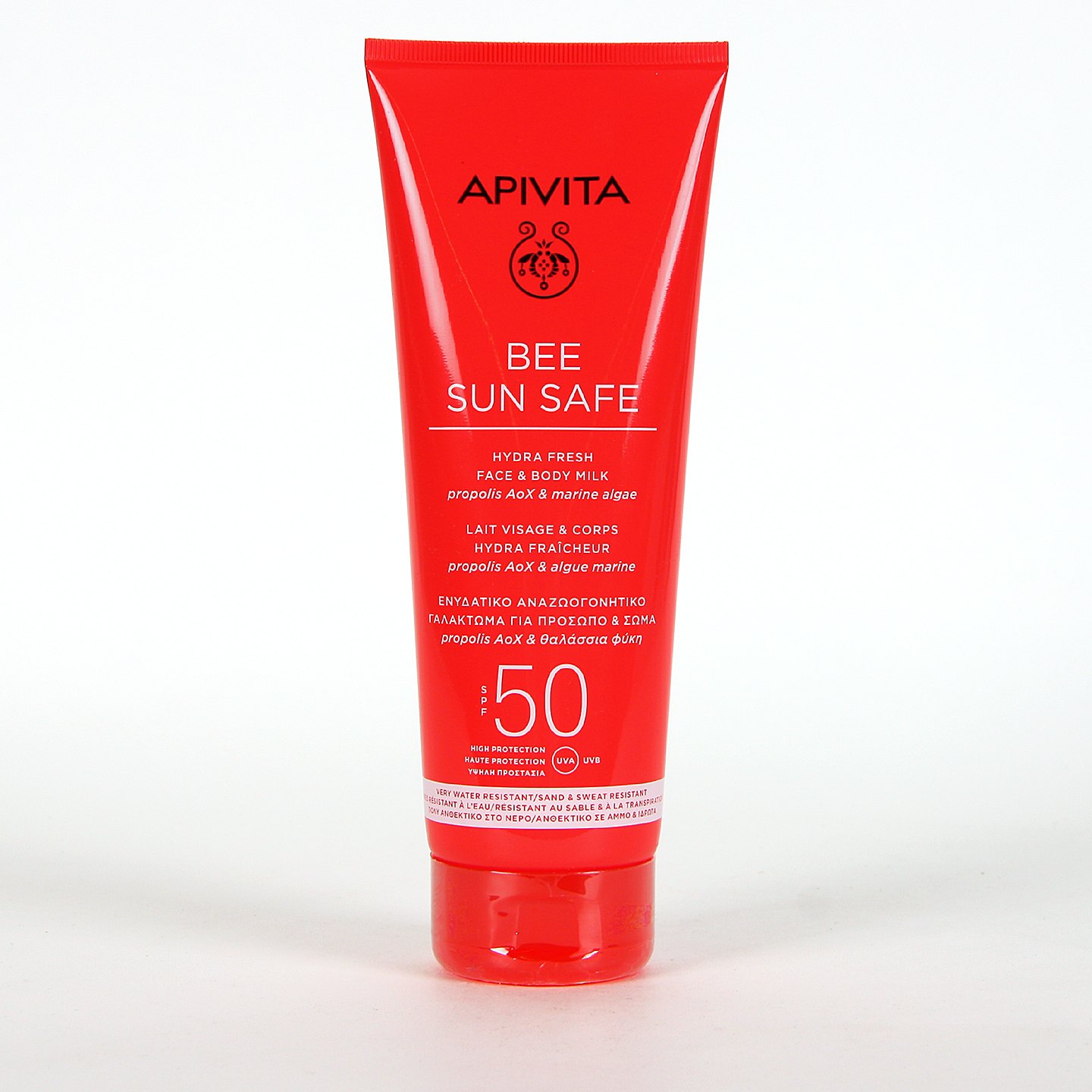 Apivita Bee Sun Safe Hydra Fresh Leche SPF50 200ml es un fotoprotector de muy alta protección para proteger rostro y cuerpo ofreciendo una sensación inmediata de frescura e hidratación en la piel. Se absorbe rápidamente, es una protección ideal para las actividades del verano porque es resistente al agua, a la arena y al sudor.