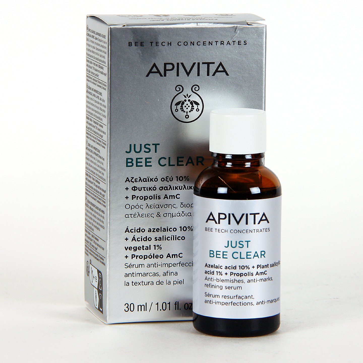 Apivita Just Bee Clear Serum es un sérum facial antiimperfecciones diseñado para pieles grasas o con tendencia acneica. Su fórmula combina activos dermatológicos y botánicos que ayudan a reducir las imperfecciones, mejorar la textura de la piel y atenuar las marcas del acné, mientras contribuyen a mantener el equilibrio cutáneo. Además, el sérum actúa sobre la biopelícula de Cutibacterium acnes, la bacteria implicada en la aparición de granos, ayudando a limitar su proliferación.
