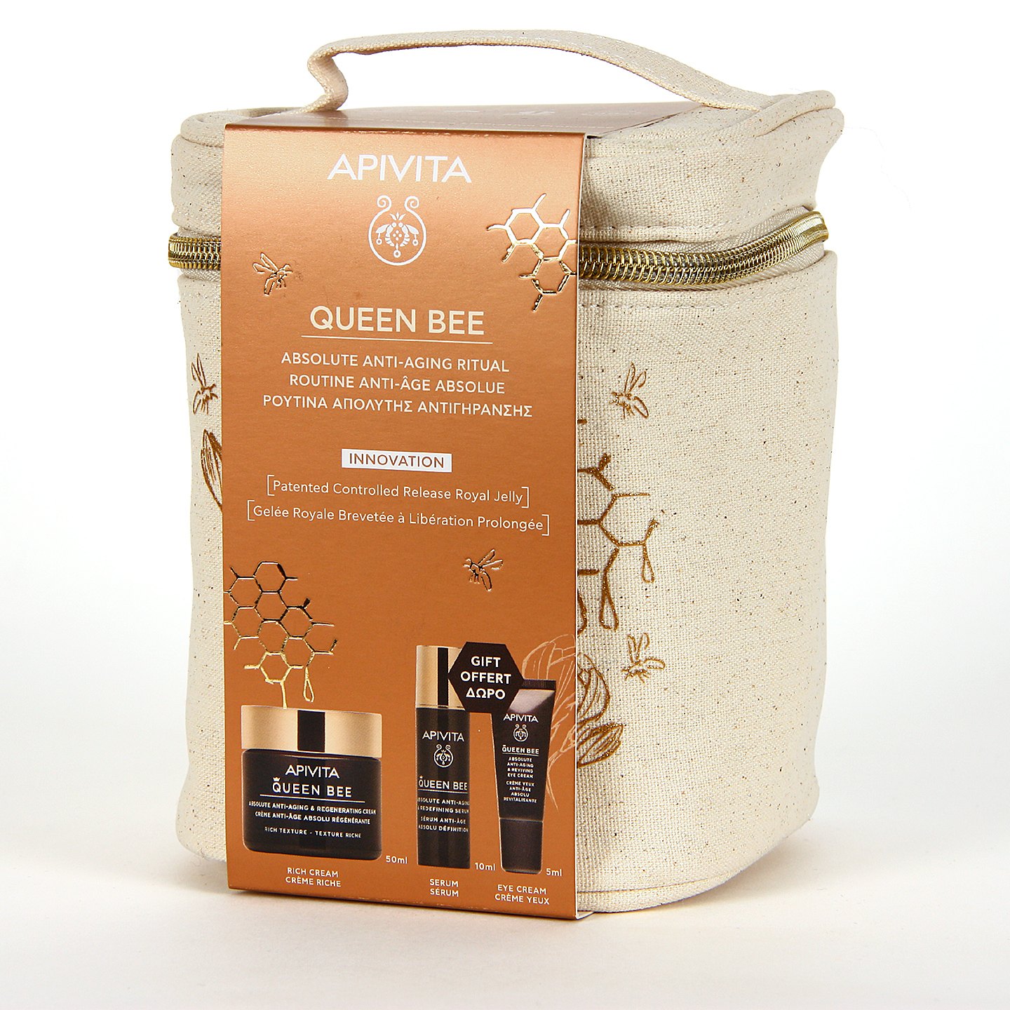 PROMOCIÓN: Por la compra de la Crema Regeneradora Absoluta Textura Rica de Apivita Queen Bee regalamos un neceser exclusivo que incluye Apivita Quee Bee Serum 10ml y Apivita Bee Queen Contorno 5ml. ¡Solo hasta agotar existencias!