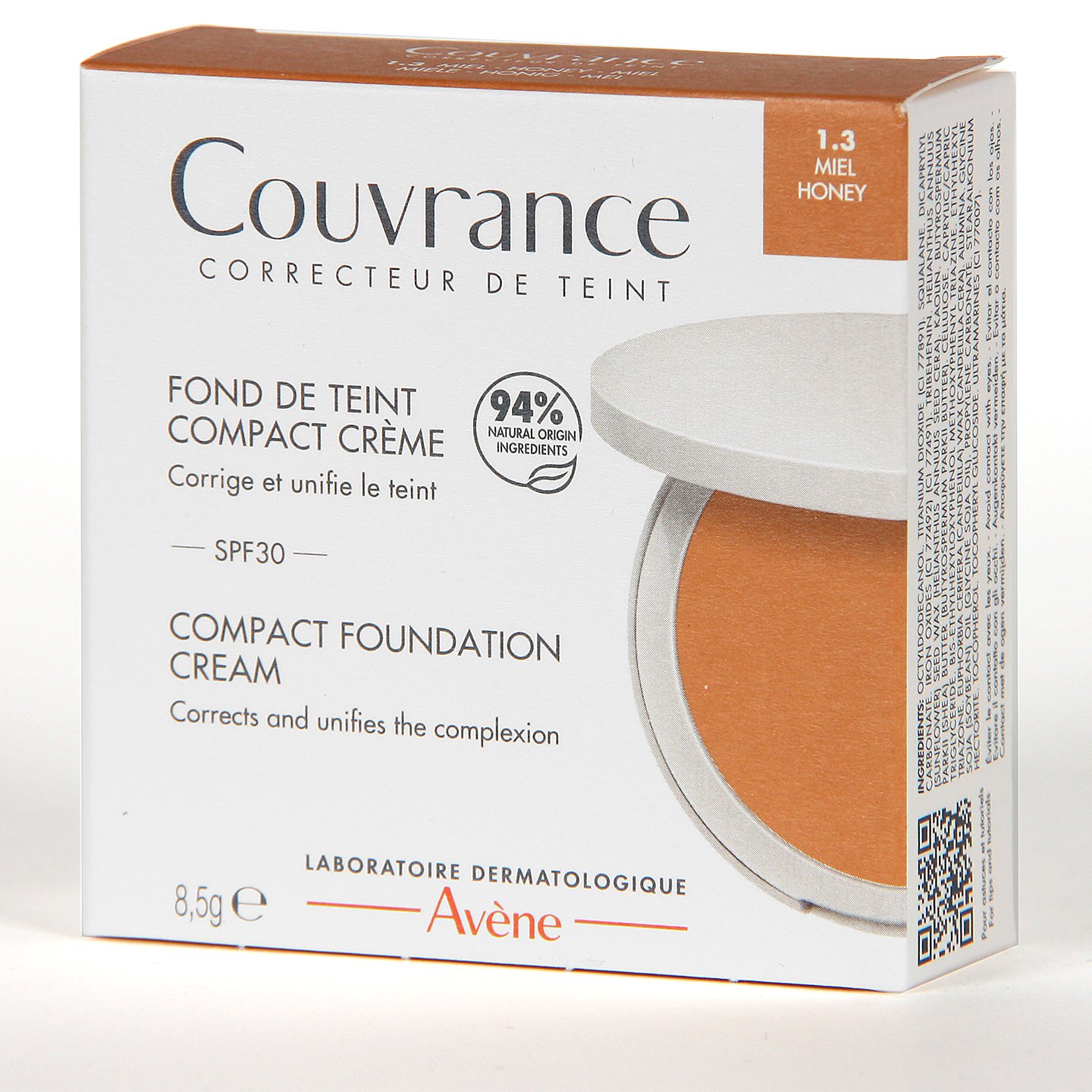 Avene Couvrance Crema Compacta Miel 1.3 es una crema textura oil-free con efecto mate para las pieles grasas con tendencia acneica. Formulada para pieles sensibles grasas que maquillan y camuflan de manera natural las imperfecciones severas gracias a su alto contenido en pigmentos (45%) consiguiendo un alto poder cubriente. Resistente al sudor y al agua además de poseer filtro SPF30 frente a la radiación solar. Producto hipoalergénico y sin perfumes.