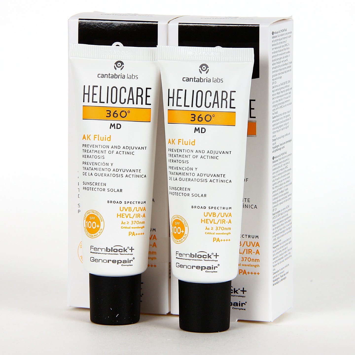 Heliocare 360 MD AK Fluid SPF 100+ Pack Duplo es un fotoprotector de uso diario con muy alta protección solar especialmente formulado para pieles sensibles al sol, fotodañadas y con queratosis actínica, así como para la prevención complementaria en pieles con riesgo de desarrollar otras formas de cáncer cutáneo no melanoma.