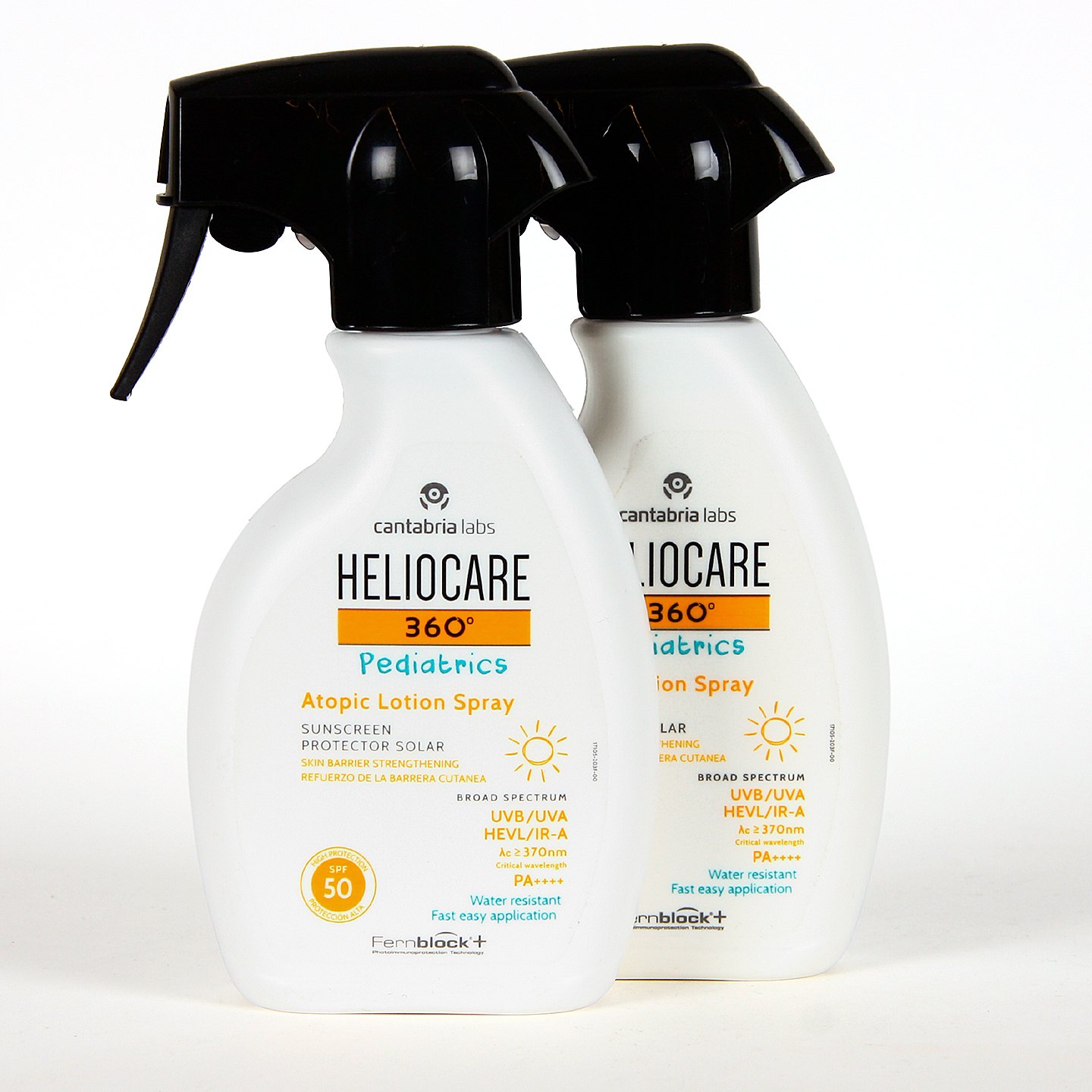 Heliocare 360 Pediatrics Atopic Loción Spray SPF 50 250 ml PACK DUPLO es un estuche ahorro que incluye 2 envases de fotoprotector corporal infantil en spray específicamente desarrollados para la piel atópica, sensible y reactiva de bebés y niños a partir de 3 meses.