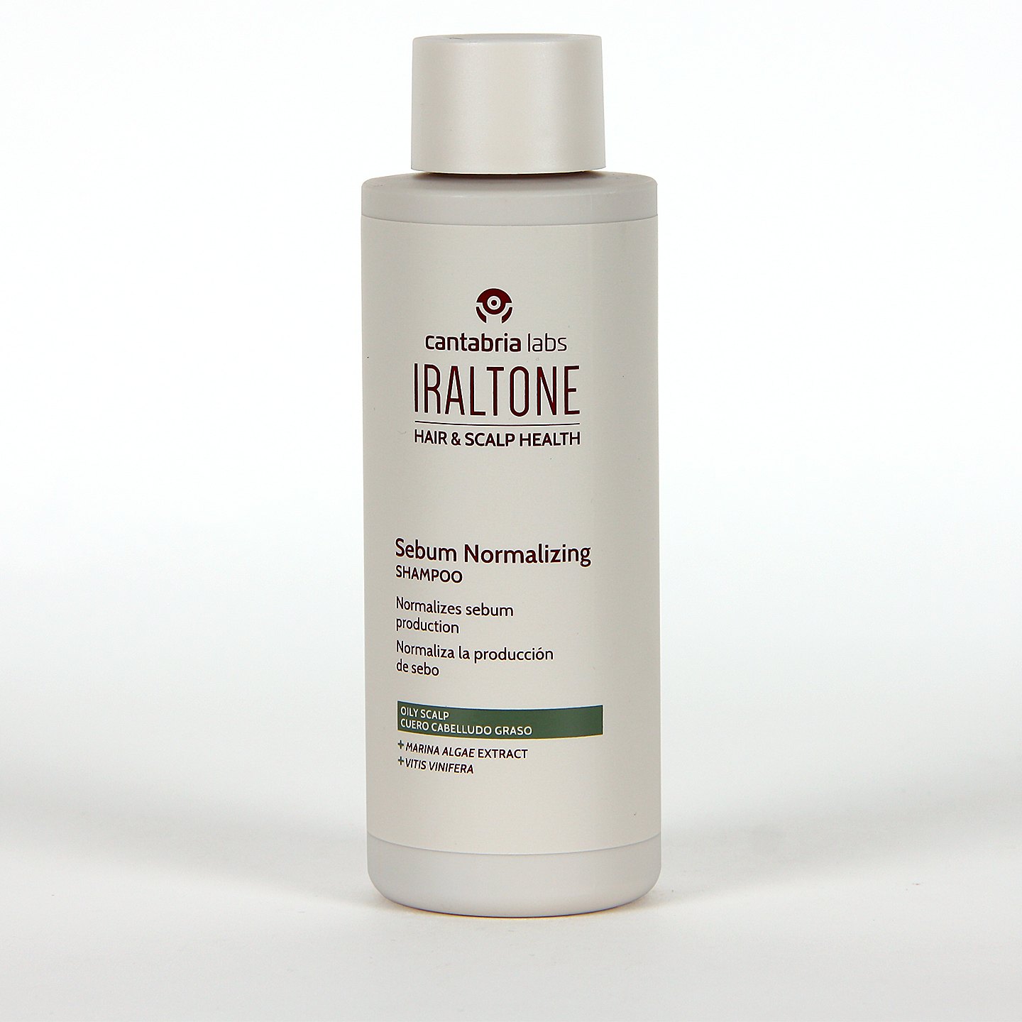 Iraltone Champú Sebo-regulador, tratamiento del cabello graso y la caspa grasa con acción seborreguladora, antioxidante y antiinflamatoria, con Matmarine algae, vitamina E, vitis vinifera y Proteolan, un agente surfactante que preserva la barrera cutánea.
