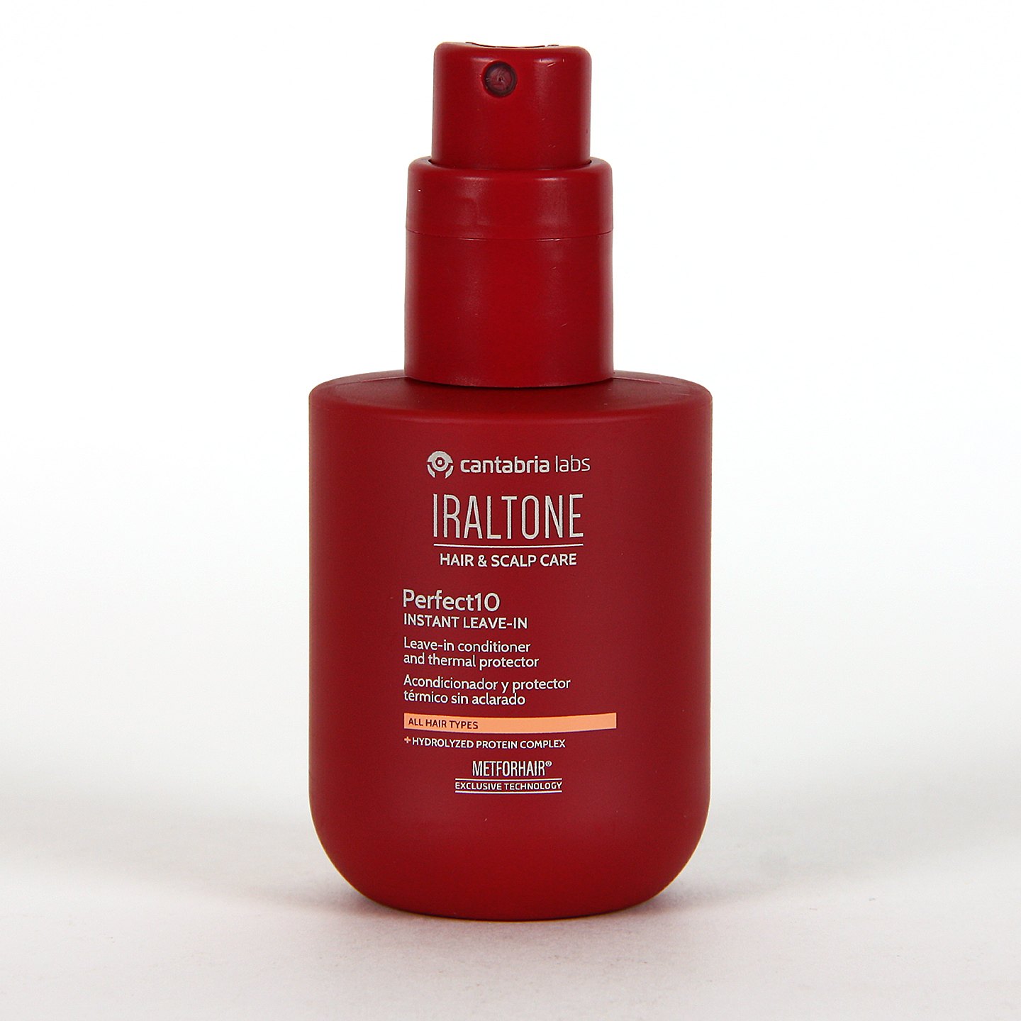 Iraltone Perfect10 Acondicionador Sin Aclarado es un cuidado capilar en spray que reestructura el cabello seco y dañado, mejorando su suavidad y elasticidad, aumentando a su vez la resistencia y fuerza de la fibra capilar, previniendo y evitando su rotura. Este acondicionador con proteínas hidrolizadas ofrece también una protección térmica capilar, ideal para todo tipo de cabellos, que evita el encrespamiento y protege el color, aumentando a su vez el brillo y suavidad del cabello.