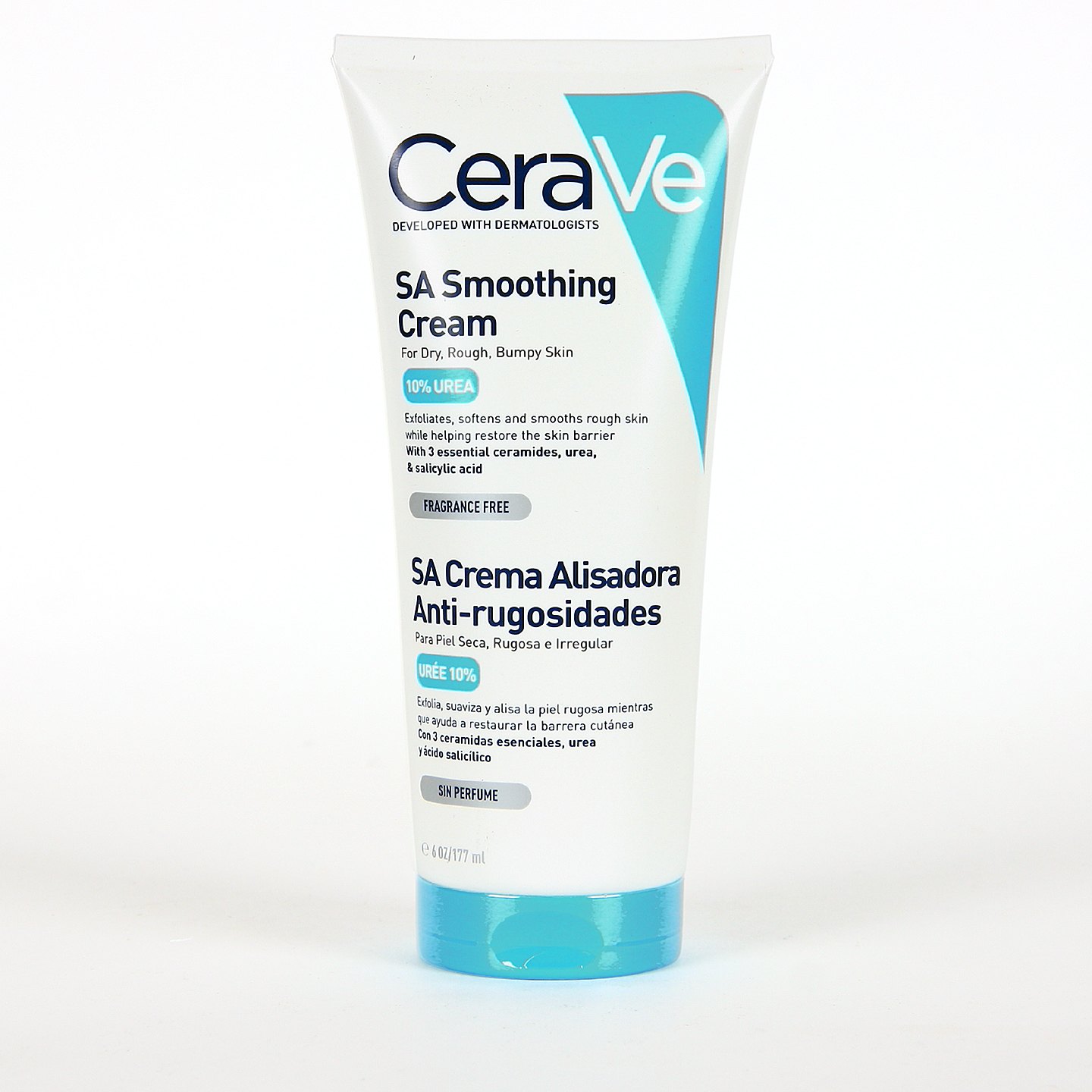 Cerave SA Crema Alisadora Anti-Rugosidades es un tratamiento altamente hidratante con una textura no grasa formulado para suavizar, alisar e hidratar en profundidad la piel seca, irregular y rugosa. Ayuda a reparar su barrera gracias a su fórmula enriquecida con una combinación sinérgica de Urea, Ácido salicílico y Ácido hialurónico. Además, la tecnología MVE® y las tres ceramidas esenciales de Cerave ayudan a reparar la barrera protectora de la piel gracias a la liberación controlada de sus ingredientes, con resultados que duran durante todo el día.