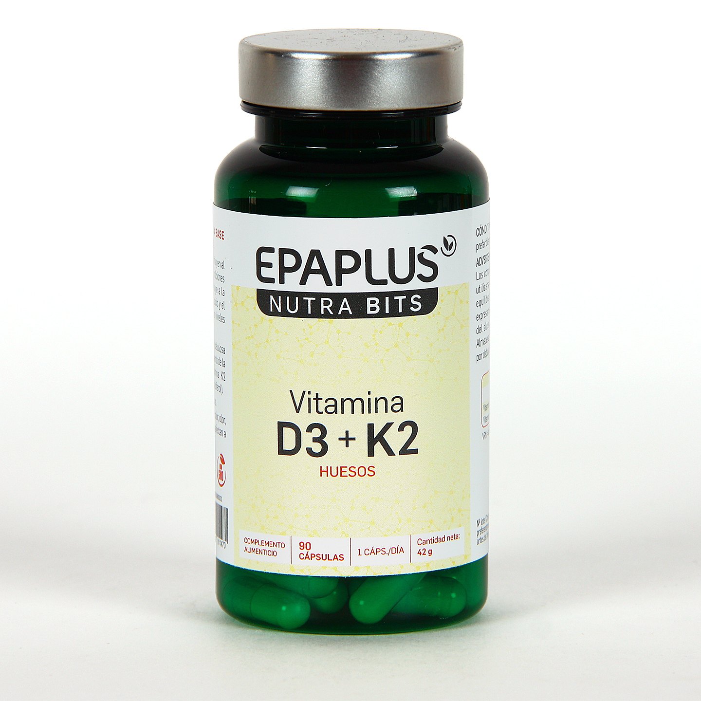 Epaplus Nutra Bits Vitamina K2+D3 Cápsulas es un complemento alimenticio que combina 2000 UI de vitamina D3 (colecalciferol) con vitamina K2 (menaquinona-7), dos nutrientes esenciales que actúan de forma sinérgica en el metabolismo óseo. Su formulación se presenta en cápsulas vegetales, fabricadas bajo estándares GMP y con calidad farmacéutica, pensadas para un uso continuado y seguro. Este complemento alimenticio destaca por su fórmula pura, sin azúcares, sin gluten, sin lactosa y apta para personas veganas, convirtiéndose en una opción práctica y bien tolerada para el uso diario.