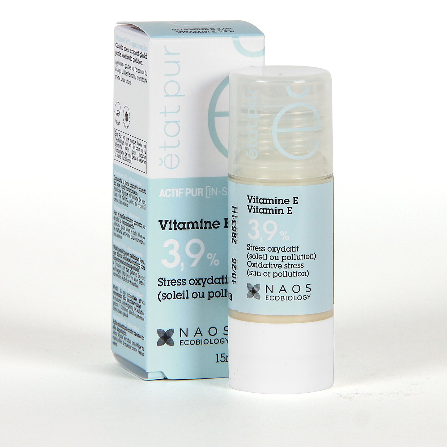 Etat Pur Vitamina E 3.9% 15ml, previene el envejecimiento prematuro de la piel provocado por la exposición solar o la contaminación. Potente acción antioxidante, refuerza las capacidades naturales de defensa de la piel frente a las agresiones ambientales y al estrés oxidativo.