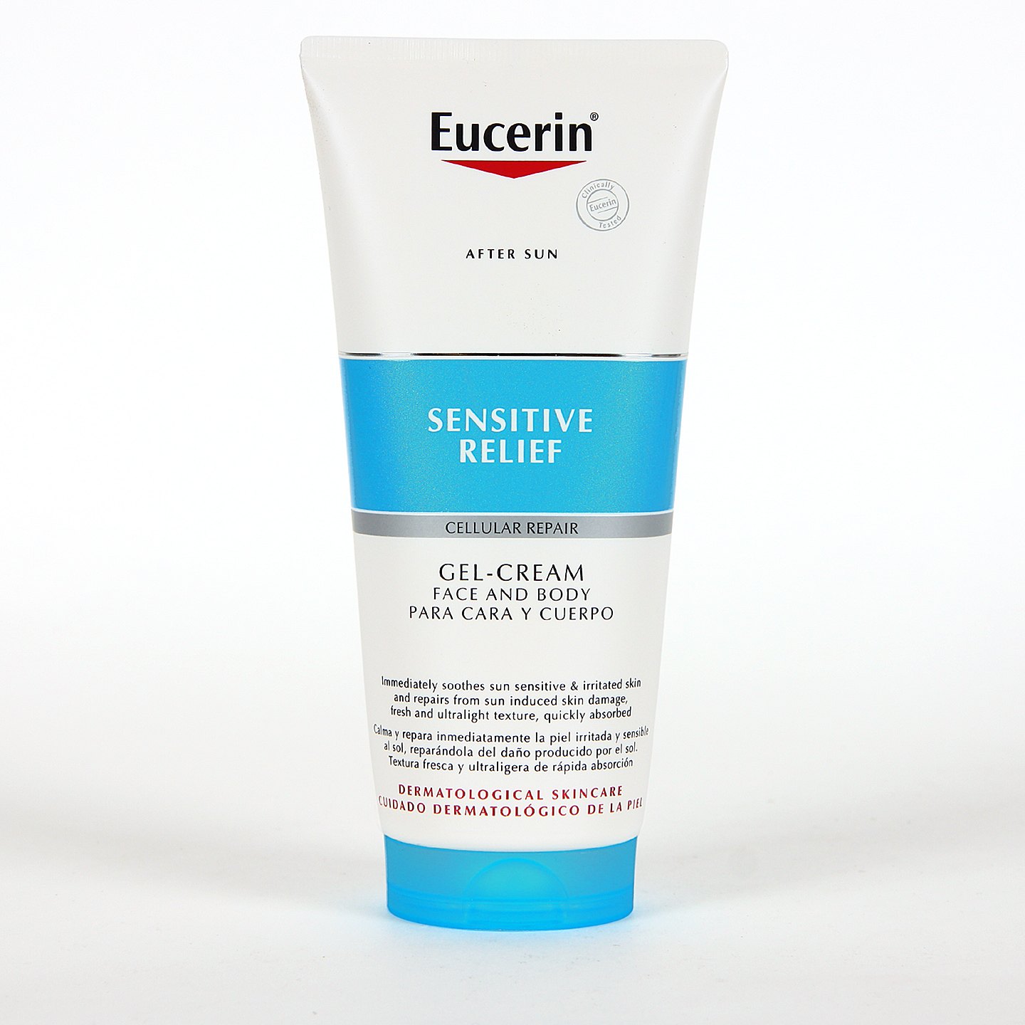 Eucerin After Sun Sensitive Relief Gel Cream es un gel-crema calmante diseñado para reconfortar y regenerar la piel después de la exposición solar. Su fórmula innovadora combina ingredientes antioxidantes y antiinflamatorios que ayudan a proteger la piel sensible del estrés oxidativo y las agresiones derivadas de los rayos UV y la luz azul (HEVIS), aliviando el enrojecimiento, la tirantez y la sensación de incomodidad. Con una textura ligera y de rápida absorción, puede aplicarse en cara y cuerpo, resultando ideal tras la exposición solar intensa o prolongada.