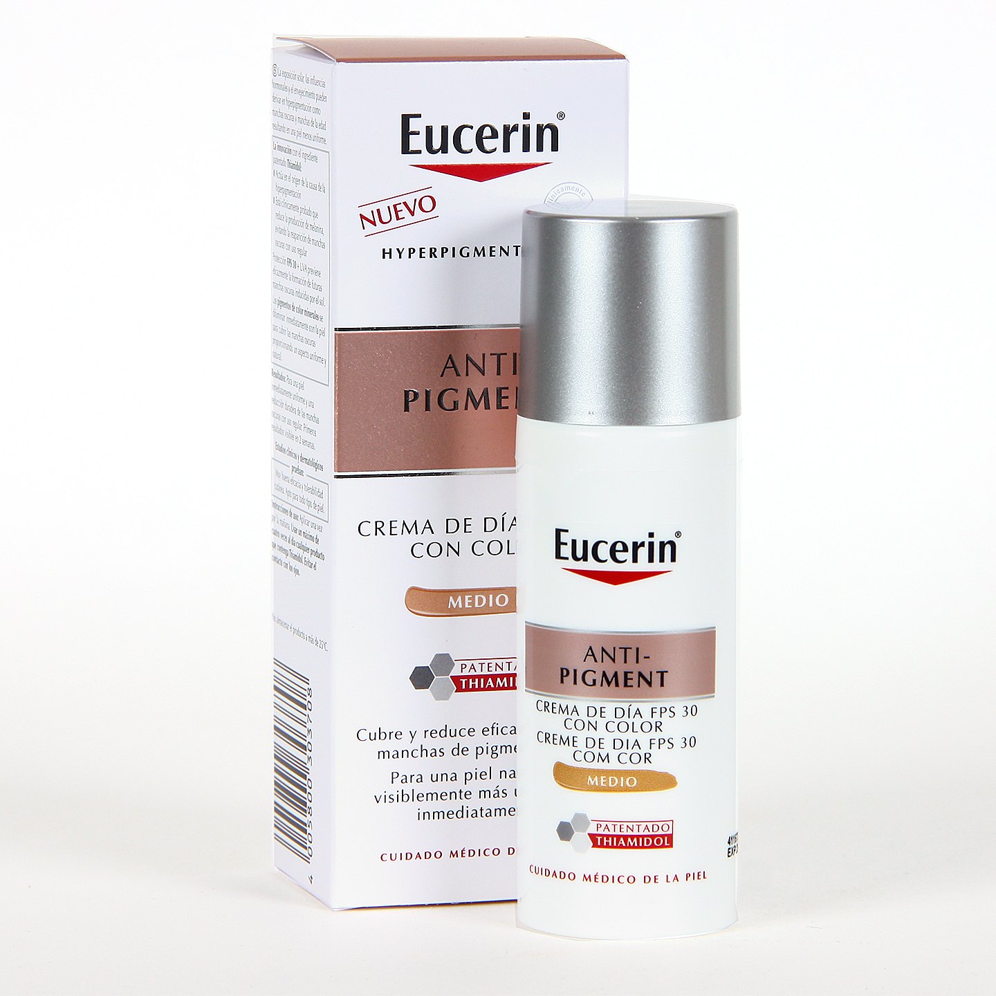 Eucerin Anti-Pigment Crema de Día FPS 30 Tinted es una crema facial con color diseñada para reducir las manchas de hiperpigmentación (solares, postinflamatorias, hormonales o relacionadas con la edad). Su ingrediente estrella, el Thiamidol, actúa directamente en la raíz de la producción de melanina para aclarar las manchas visibles en apenas 2 semanas y evitar que reaparezcan con el uso continuado.