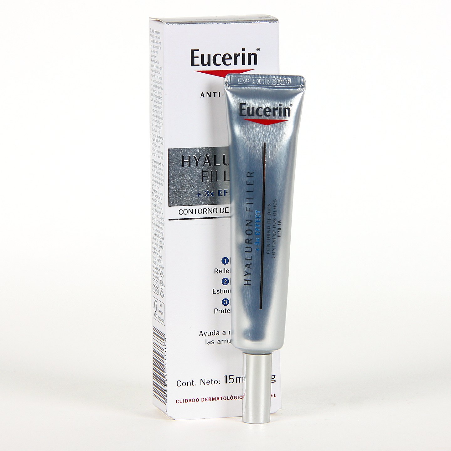 Eucerin Hyaluron-Filler Contorno de Ojos reduce líneas de expresión y arrugas, aporta hidratación intensa y mejora la firmeza de la zona periocular. Su fórmula con Ácido Hialurónico de alto y bajo peso molecular y Saponina actúa desde las capas profundas para rellenar arrugas y prevenir su avance.