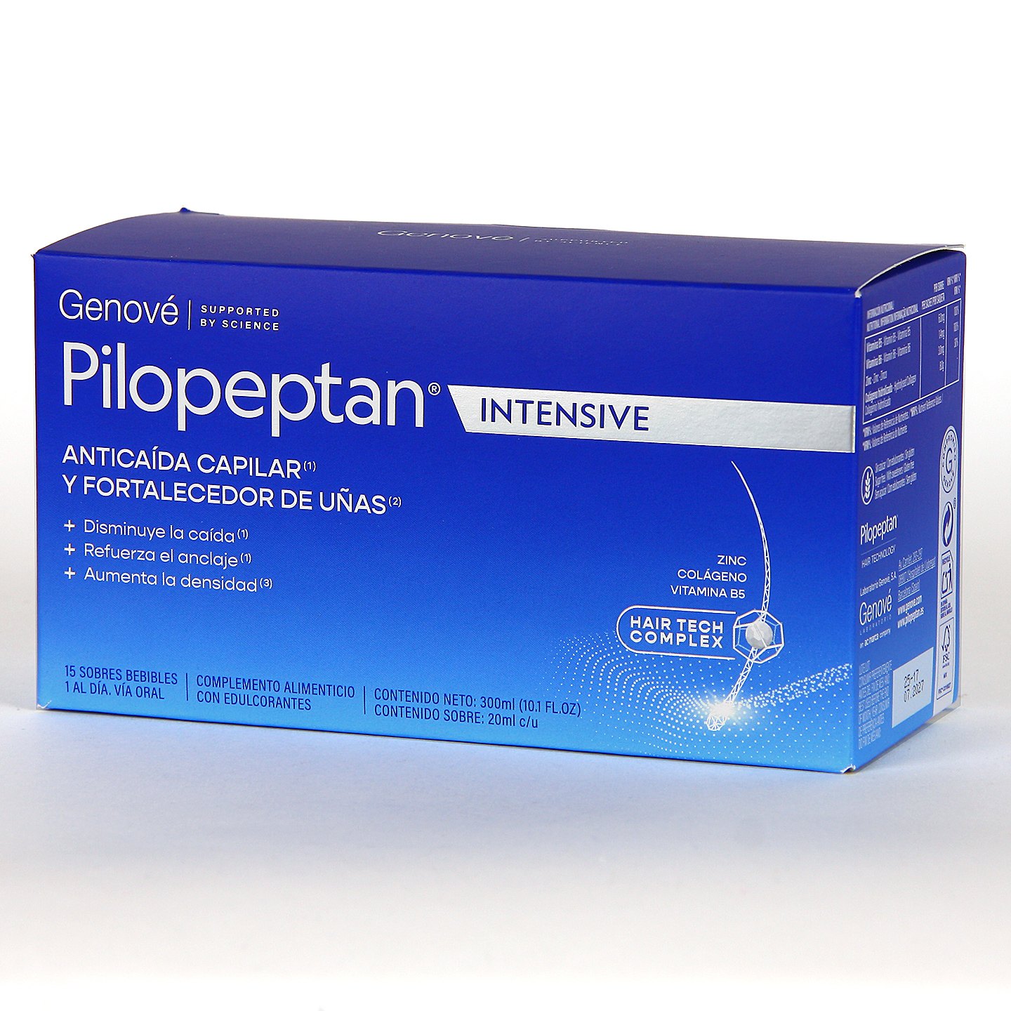 Genové Pilopeptan Intensive 15 Sobres es un complemento alimenticio en formato sobre bebible que trata la caída aguda del cabello. Frena la caída capilar, fortalece el cabello y las uñas gracias a su formulación rica en colágeno hidrolizado, vitamina B5, vitamina B6 y Zinc. Complemento imprescindible como tratamiento intensivo previo a cualquier otro complemento nutricional anticaída.