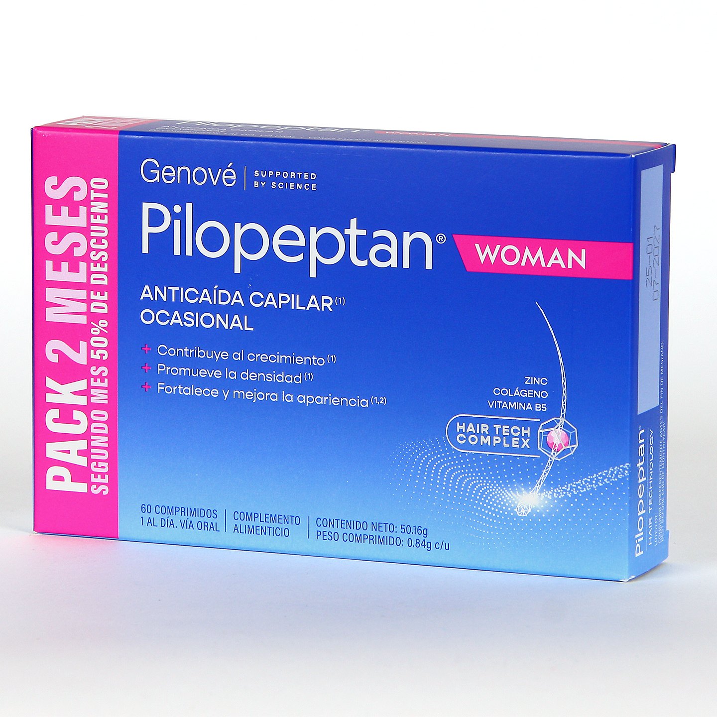 Genové Pilopeptan Woman 60 Comprimidos Sabor Vainilla es un complemento alimenticio específico para la caída del cabello ocasional en la mujer. Su formulación con Ácido hialurónico, Colágeno hidrolizado, Aminoácidos azufrados, Minerales y Vitaminas del grupo B compensa las carencias nutricionales en ciertos estados que pueden causar efluvio telógeno.