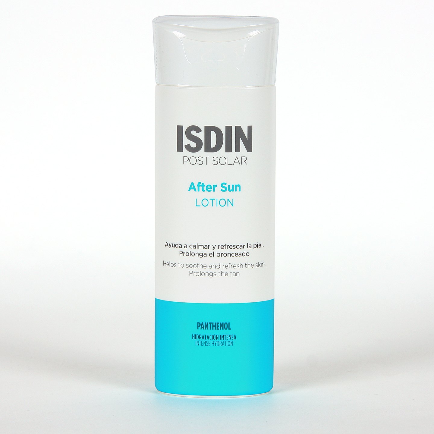 Isdin After-Sun Lotion es una loción corporal calmante, refrescante e hidratante para después del sol especial insolaciones y de efecto reparador. Alivia e hidrata instantáneamente la piel irritada por la sobreexposición al sol. Evita la descamación prolongando el bronceado, ya que regenera el epitelio disminuyendo la posibilidad de sobreinfección bacteriana en la piel frágil. De rápida absorción. Sin parabenos.