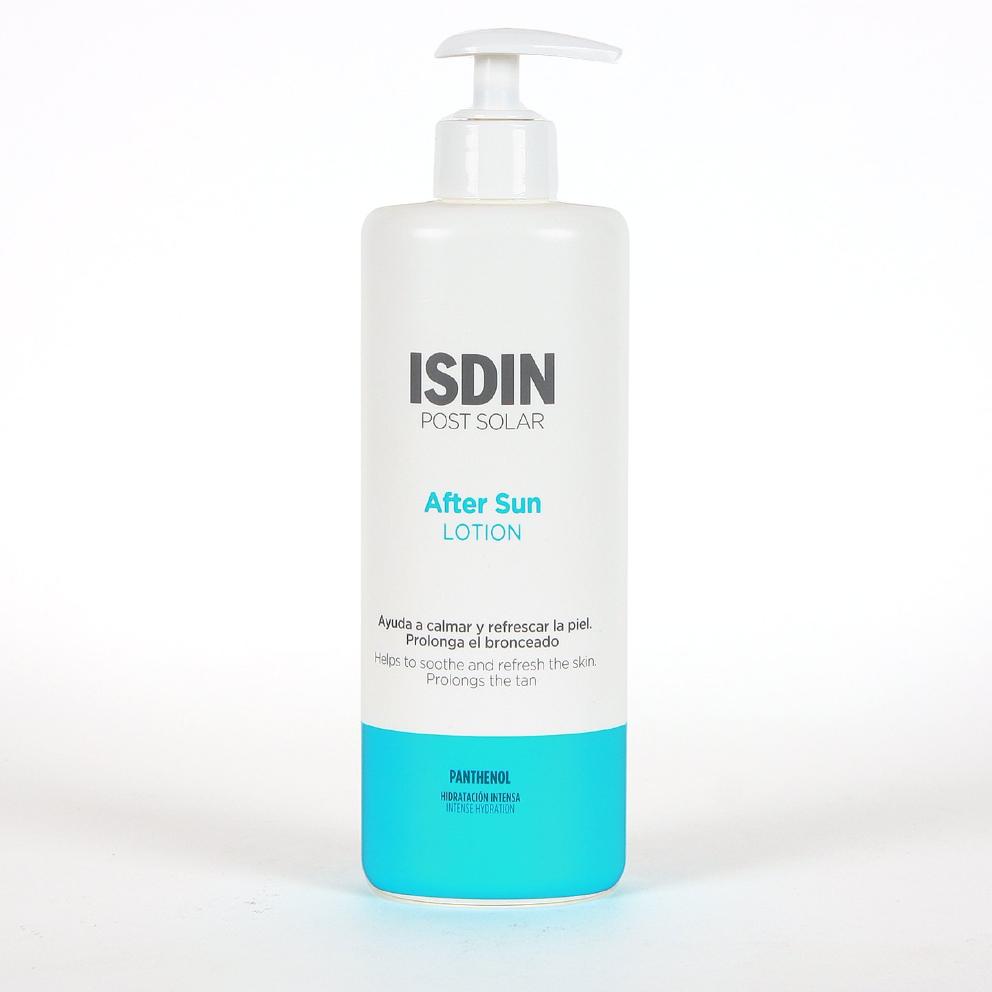Isdin After-sun Lotion 400 ml es una loción corporal calmante, refrescante e hidratante para después del sol especial insolaciones y de efecto reparador.  Alivia e hidrata instantáneamente la piel irritada por la sobreexposición al sol. Evita la descamación prolongando el bronceado,  ya que regenera el epitelio disminuyendo la posibilidad de sobreinfección bacteriana en la piel frágil. De rápida absorción. Sin parabenos.