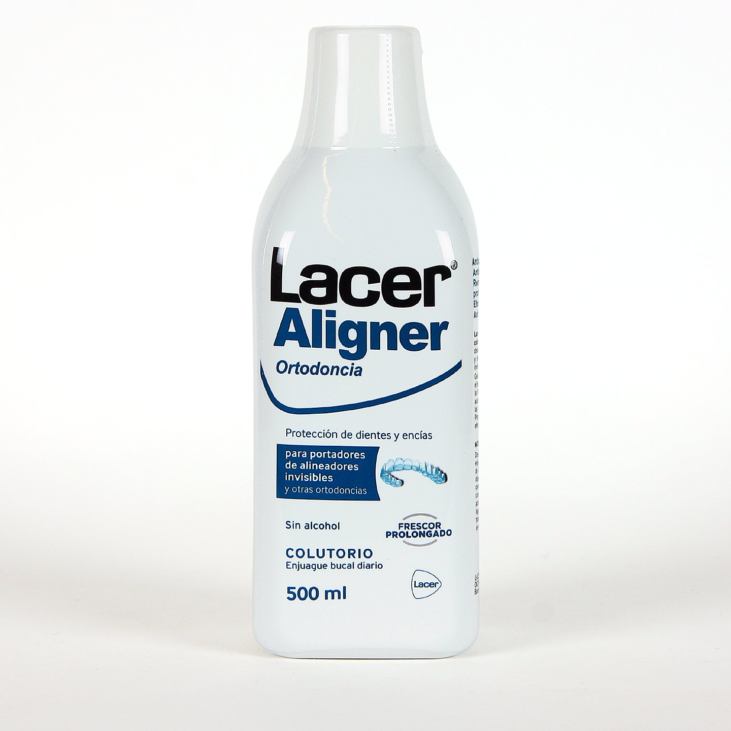 Lacer Aligner Colutorio 500 ml es un enjuague bucal de uso diario formulado específicamente para portadores de alineadores invisibles y otras ortodoncias, diseñado para reforzar la protección del esmalte dental y cuidar las encías durante todo el tratamiento ortodóncico.