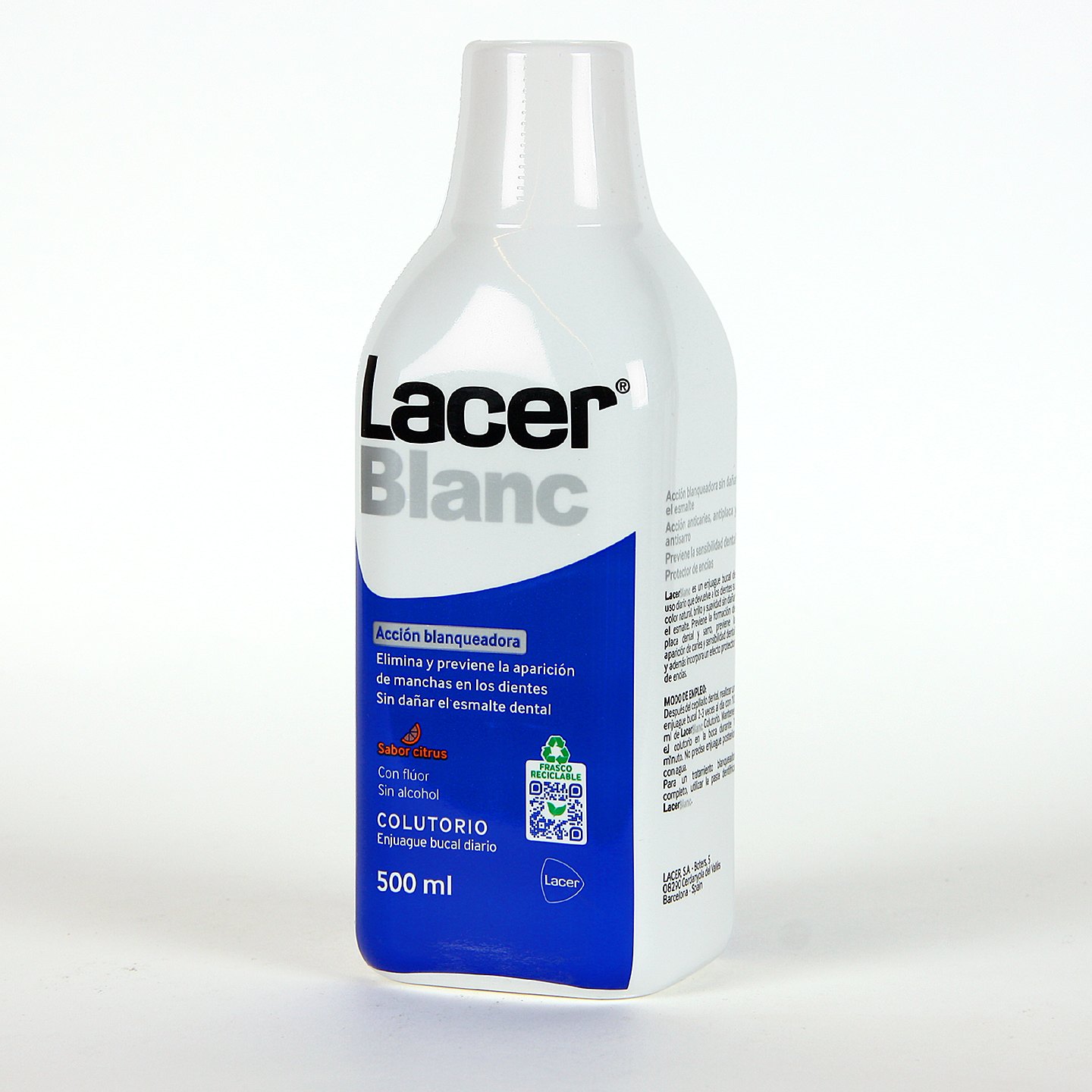 Lacer Blanc Colutorio 500ml Sabor Citrus es un enjuague bucal de uso diario que ayudar a devolver el color natural de los dientes, aportando brillo y suavidad sin dañar el esmalte dental. Su fórmula completa previene las caries y protege las encías. También indicada en el mantenimiento y prolongación del tratamiento blanqueante realizada por un profesional. Agradable sabor cítrico.