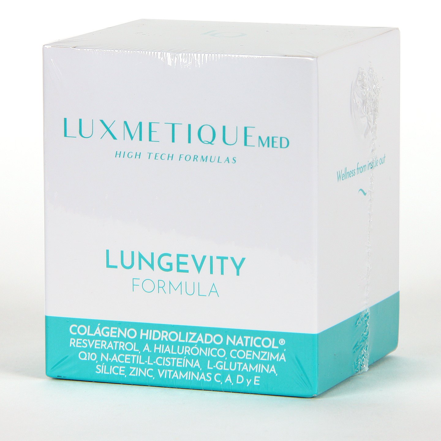Luxmetique Lungevity Fórmula 20 sobres es un complemento alimenticio compuesto por colágeno hidrolizado estandarizado en 18 aminoácidos, juntos a resveratrol, N-Acetil-L-Cisteína, Coenzima Q10, Ácido Hialurónico, extracto de Hedera helix y antioxidantes que contribuyen al bienestar en general.