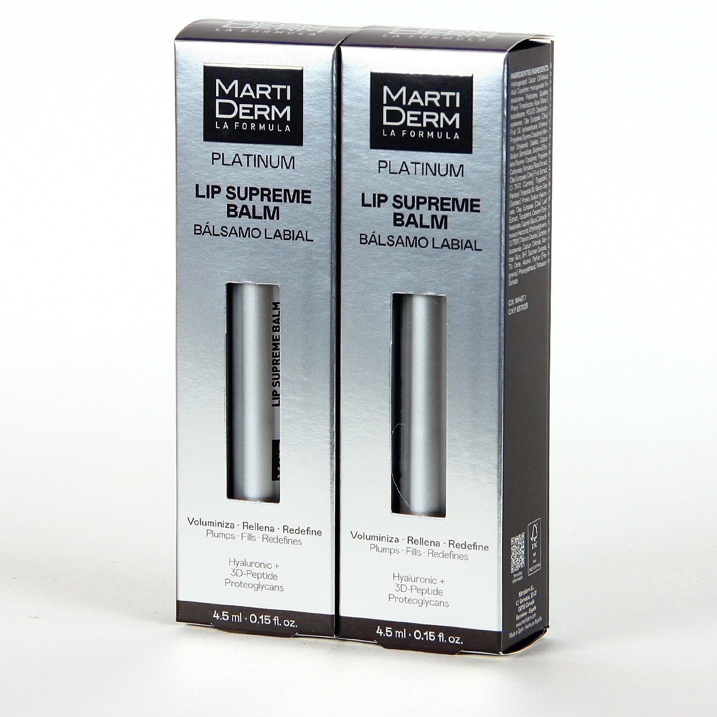 Pack Duplo Martiderm Lip Supreme Balm es un tratamiento labial con una potente acción voluminizadora, rellenadora y redensificante, que favorece que los labios además de estar intensamente hidratados, recuperen su brillo natural y estén confortables en todo momento. Su rica composición de activos contrarresta el afinamiento de los labios, favoreciendo que estén lisos y con mayor volumen.