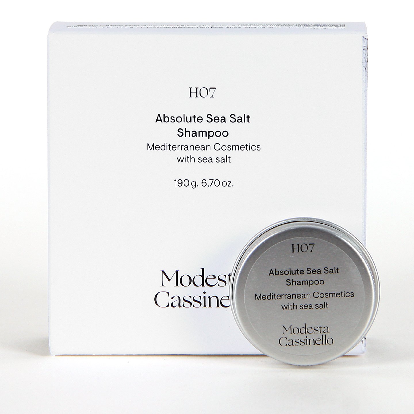 Modesta Cassinello H07 Champú con Sal marina es un producto de higiene capilar respetuoso con el cuero cabelludo, diseñado para utilizar en situaciones de sobreproducción sebácea, descamación grasa, disfunciones del microbioma o aplicación frecuente de productos de Styling. Obtenido por evaporación del agua de mar que ayuda a sanear y equilibrar el cuero cabelludo a la vez que aporta luz y cuerpo al cabello.