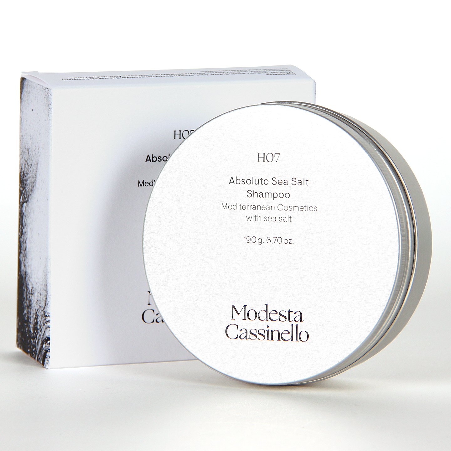 Modesta Cassinello H07 Champú con Sal marina es un producto de higiene capilar respetuoso con el cuero cabelludo, diseñado para utilizar en situaciones de sobreproducción sebácea, descamación gasa, disfunciones del microbioma o aplicación frecuente de productos de Styling. Obtenido por evaporación del agua de mar que ayuda a sanear y equilibrar el cuero cabelludo a la vez que aporta luz y cuerpo al cabello.