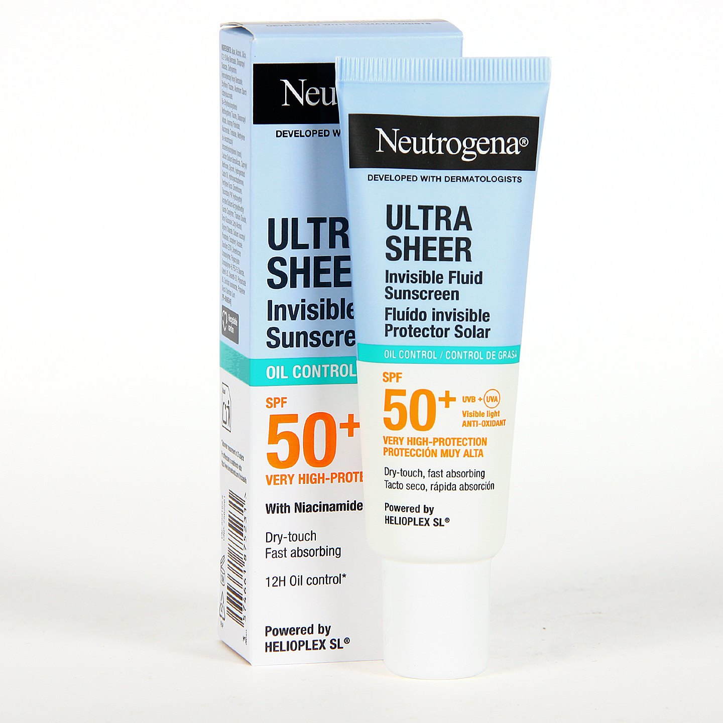 Neutrogena Ultra Sheer Fluido Invisible Control de Grasa SPF50+ es un protector solar facial avanzado especialmente formulado para pieles normales a grasas y con tendencia acneica. Su textura ultraligera y de rápida absorción proporciona un acabado de tacto seco y efecto mate durante 12 horas, eliminando los brillos no deseados y dejando la piel lista para el maquillaje. Incorpora la tecnología Helioplex , que ofrece protección muy alta frente a rayos UVB, exposición prolongada a UVA, luz visible de alta energía y agresores ambientales. Además, su fórmula con niacinamida, trehalosa y vitaminas C y E actúa como tratamiento perfeccionador, ayudando a reducir poros, manchas y marcas de acné, mientras mantiene la piel hidratada y protegida.