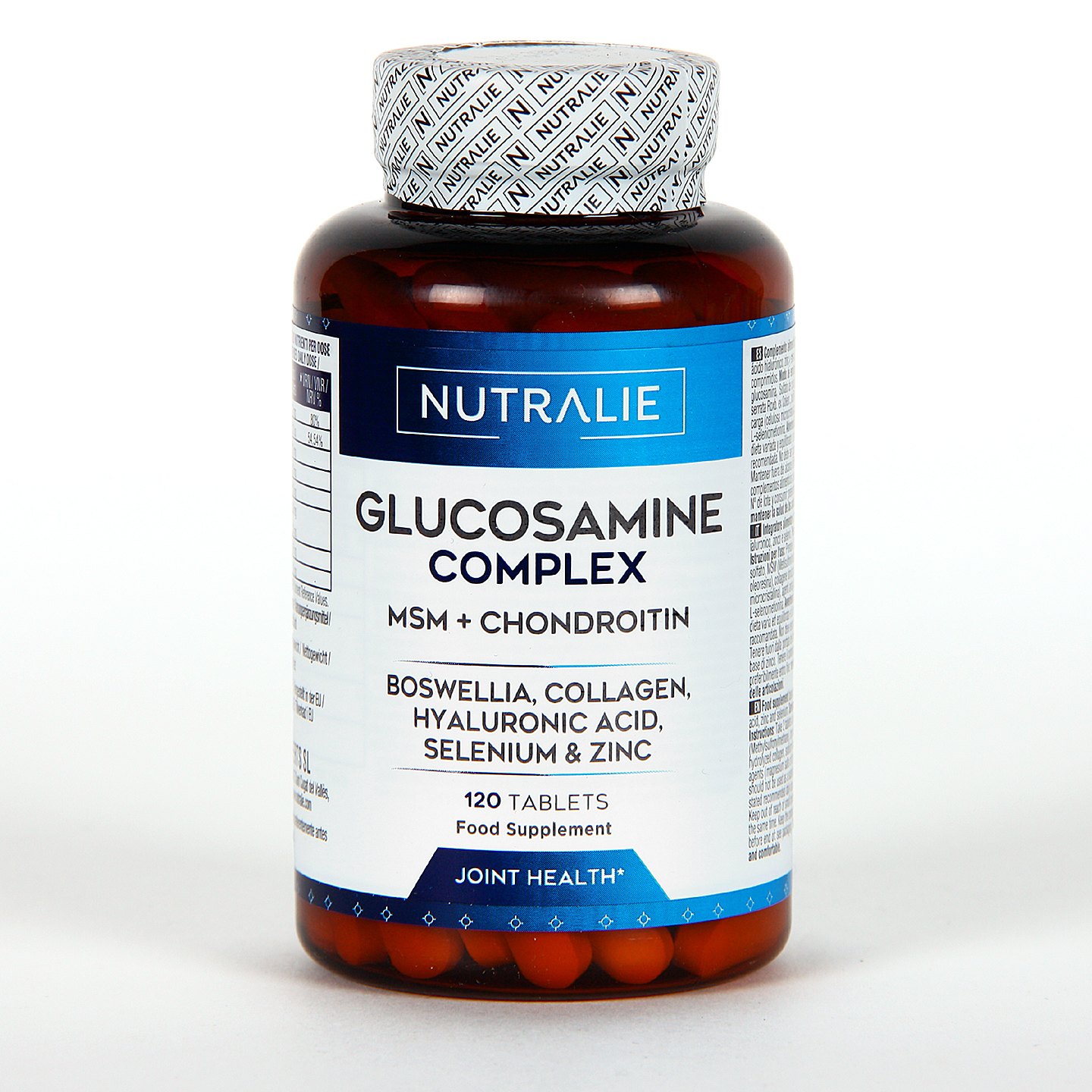 Nutralie Glucosamine + Chondroitin Complex es un complemento nutricional que ayuda al correcto funcionamiento de las articulaciones, contiene glucosamina y condroitina, dos ingredientes presentes en el cartílago. Además, en esta fórmula natural, se incluyen también MSM, ácidos boswélicos, colágeno, ácido hialurónico, selenio y zinc que favorece la formación del cartílago y mejora la función del sistema inmunitario.