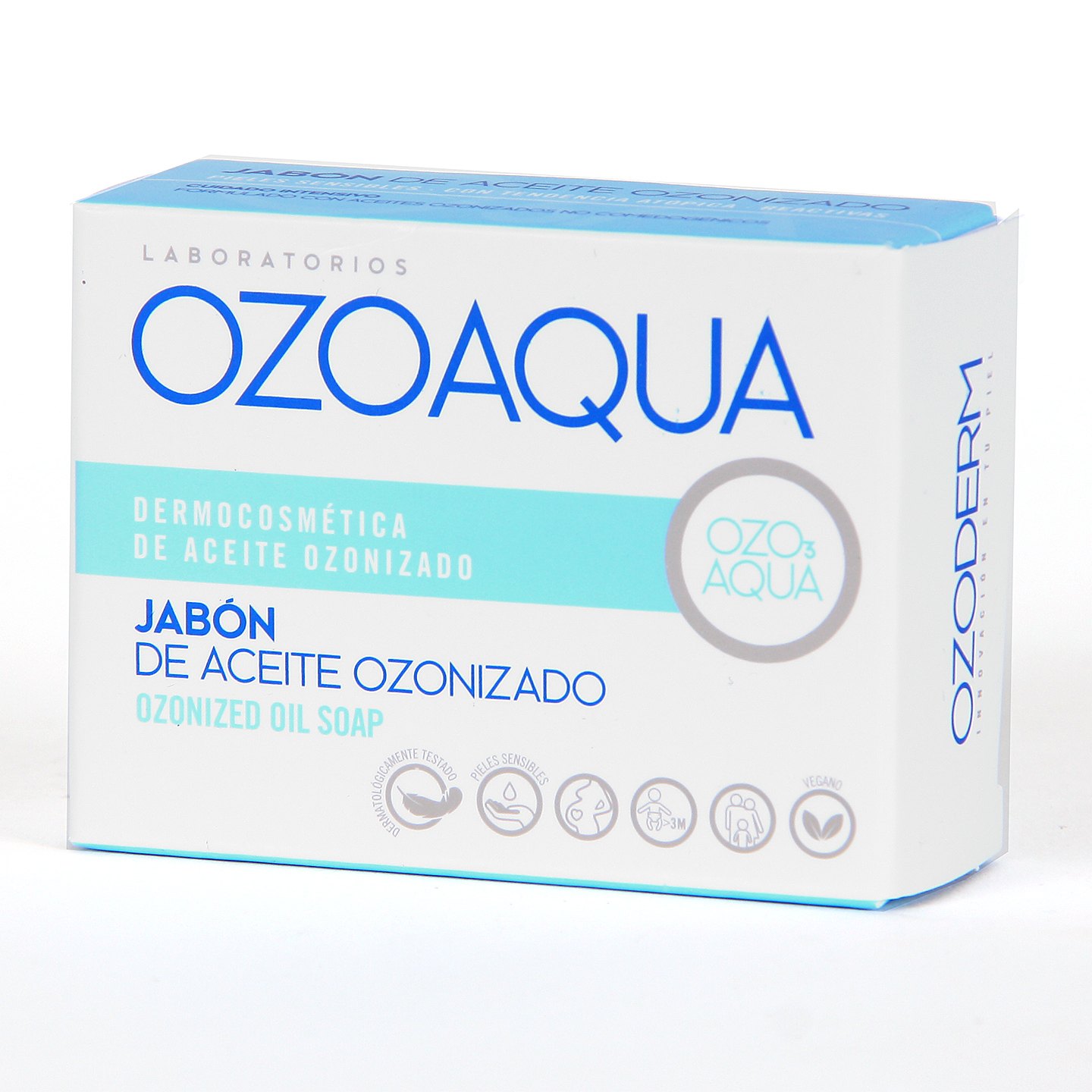 Ozoaqua Jabón de Aceite Ozonizado es un producto de higiene diseñado para el cuidado intensivo de afecciones cutáneas localizadas, formulado a base de Aceites Vegetales Ozonizados y Glicerina. Su formula minimalista limpia, higieniza y oxigena la piel protegiéndola de factores externos. Además, actúa como profiláctico de contagios y prepara la piel para tratamientos posteriores.