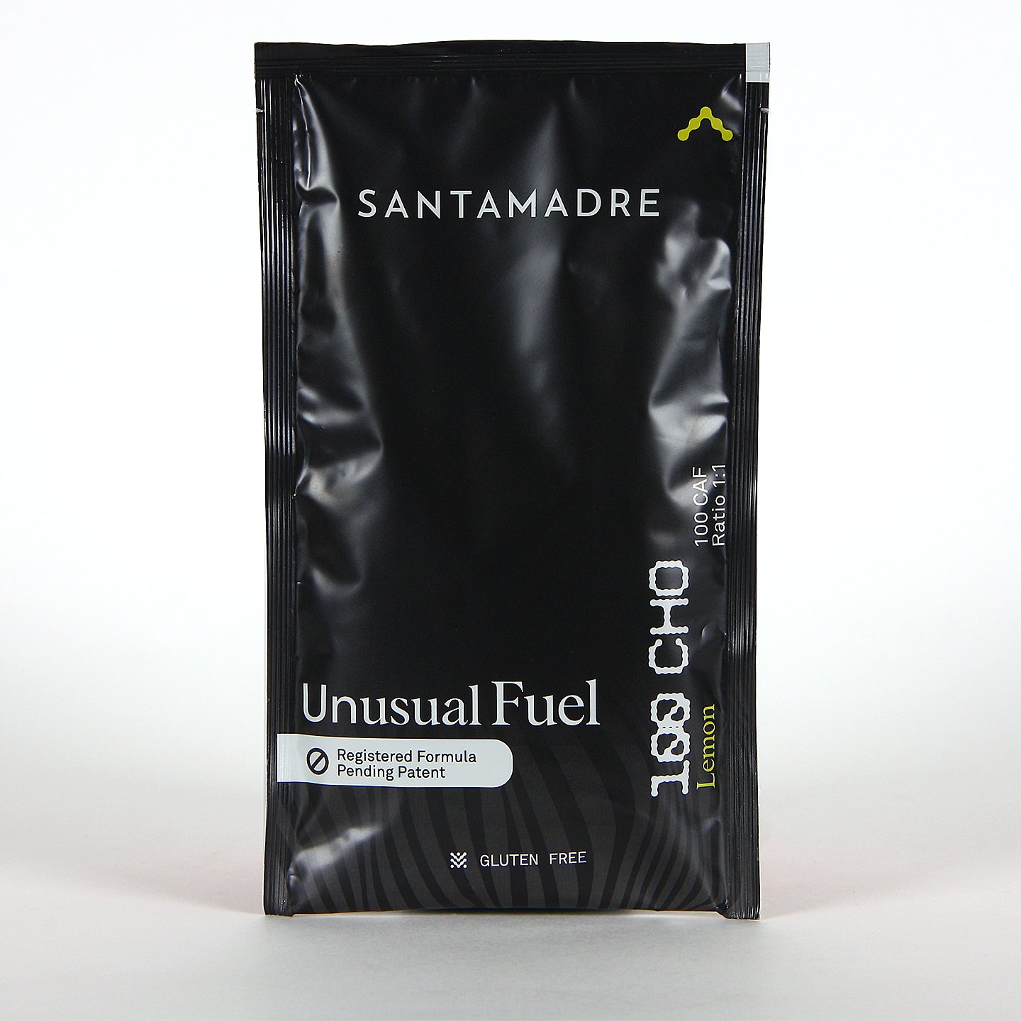 Santa Madre Unusual Fuel 100 CHO 100 Caf es una bebida energética para deportistas que aporta 100 g de carbohidratos, 100 mg de cafeína y 500 mg de sodio por cada monodosis preparado para 500 ml de agua. Con el revolucionario ratio de carbohidratos 1:1, basado en los últimos estudios científicos y ensayos de campo de la propia marca, es una bebida para alto rendimiento especialmente diseñada para ingestas de más de 110 g de hidratos de carbono por hora. Con las propiedades ergogénicas que le aporta la cafeína lo convierte en una de las mejores bebidas energéticas del mercado para el alto rendimiento deportivo.