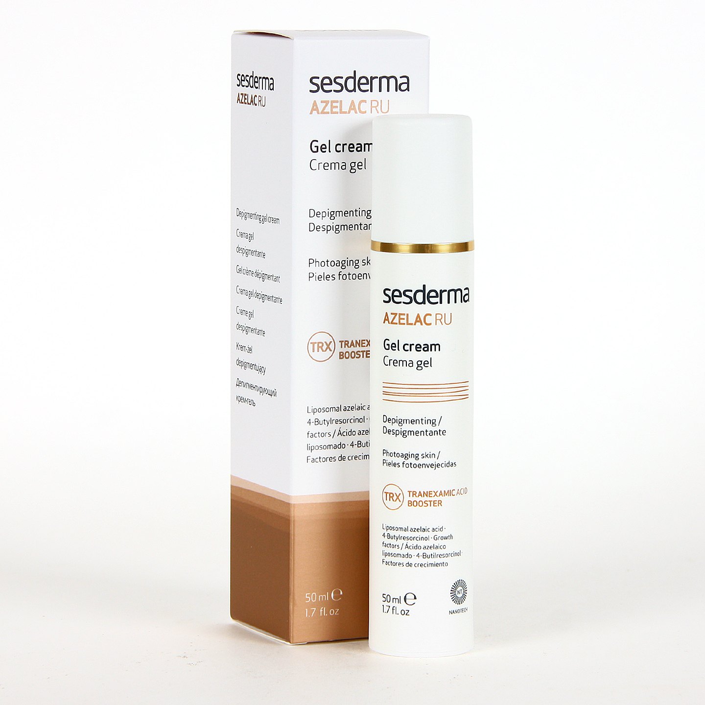 Sesderma Azelac RU Crema Gel es un despigmentante suave de textura crema gel que actúa directamente sobre las manchas, reduciendo su coloración oscura, su tamaño y evitando que aparezcan nuevas imperfecciones. Además, mantiene a raya tus manchas durante todo el año, mejorando la pigmentación y unificando el tono en pieles fotoenvejecidas, apagadas y sin brillo.