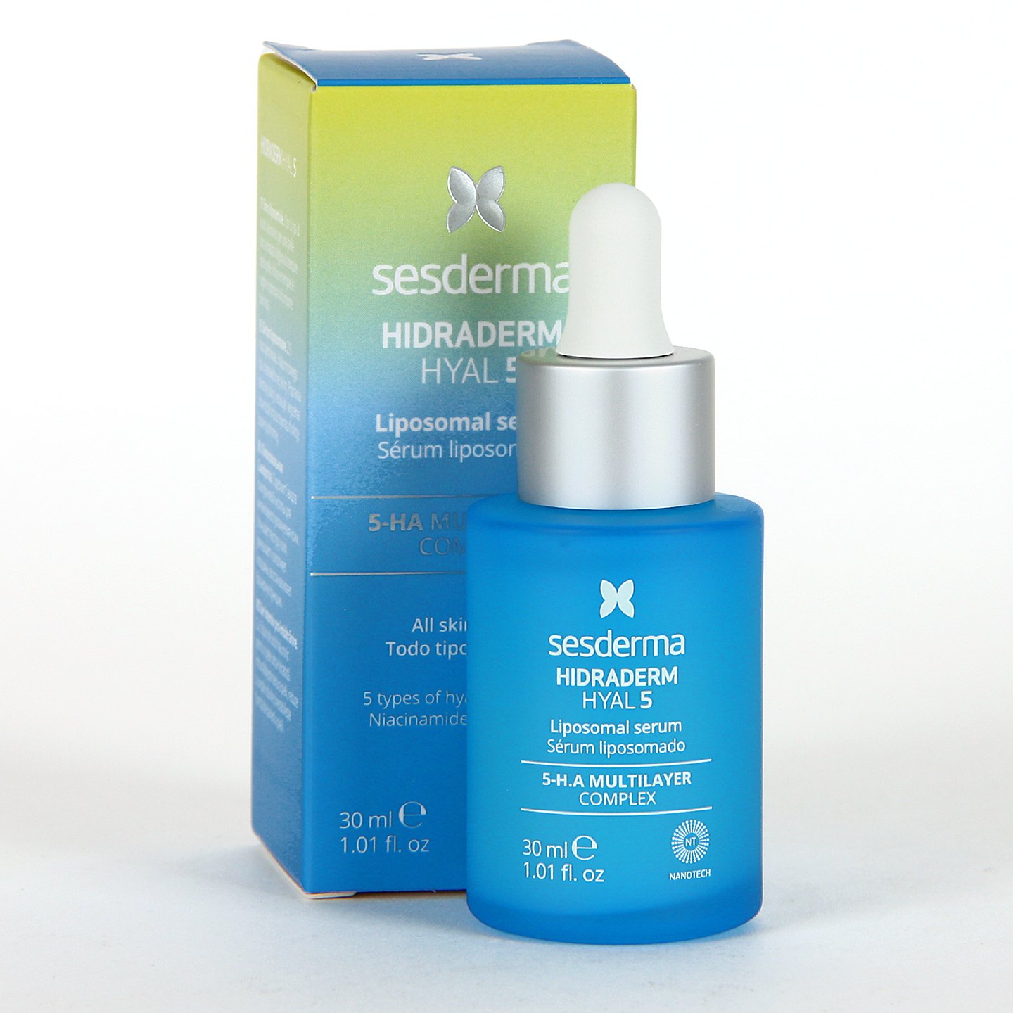Sesderma Hidraderm Hyal 5 Liposomal Serum es un cuidado con potente acción hidratante y nutritiva ideal para las pieles secas, muy secas y deshidratadas, que necesitan hidratar la piel a todos los niveles y así, contrarrestar la sensación de sequedad y tirantez del rostro. Este serum, formulado con cinco tipos de ácido hialurónico, retinaldehido y niacinamida, ofrece también un efecto relleno para conseguir una piel jugosa y con mayor elasticidad, al tiempo que trata los signos de envejecimiento, protegiendo siempre la función barrera de la piel.