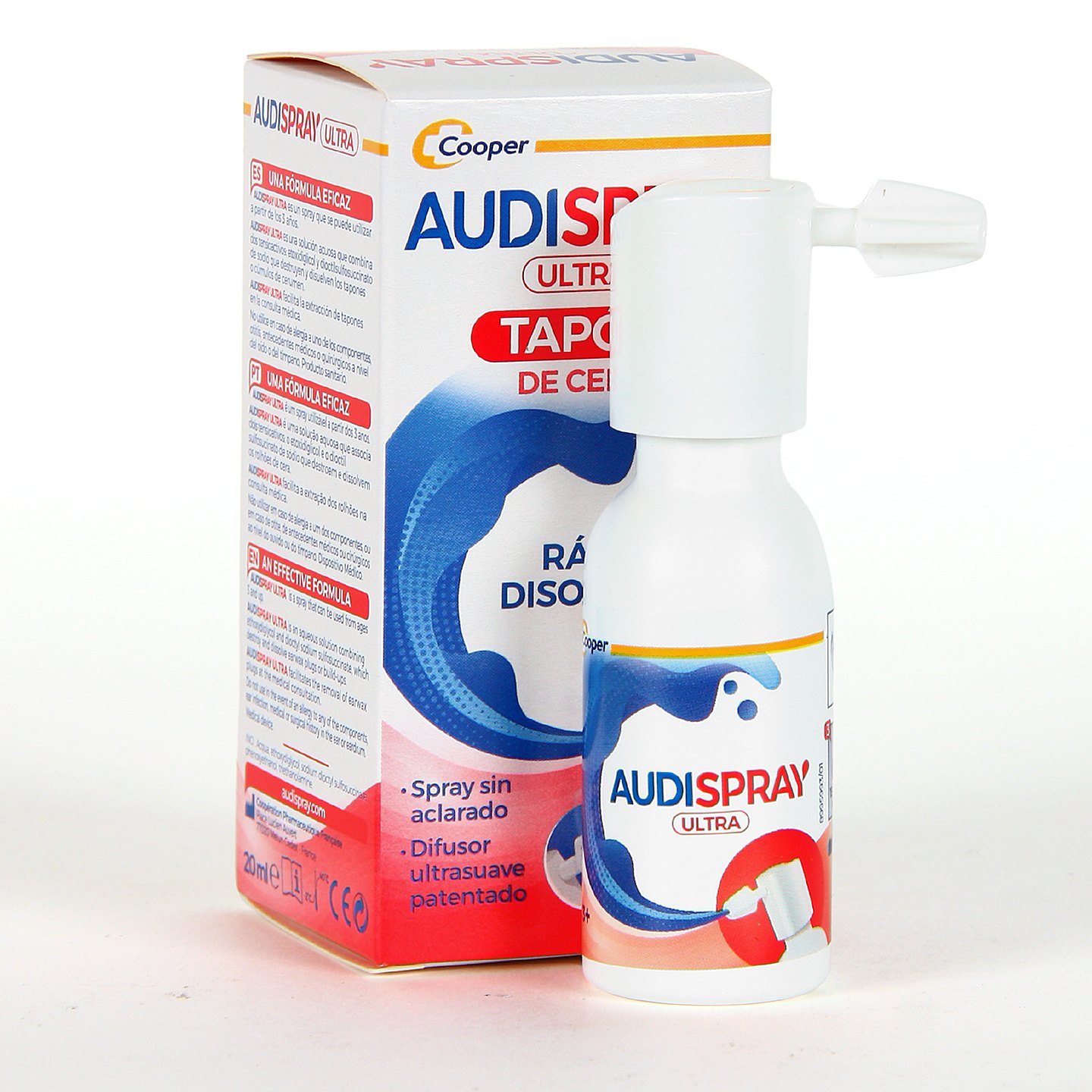 Audispray Ultra Tapones de Cerumen es un producto innovador que permite tratar un tapón en el oído ya formado o en formación, en casa y con suavidad. La solución de tratamiento disocia el tapón de cerumen en un primer momento y disuelve sus fragmentos en un segundo paso. Tratamiento sin dolor, gracias a una vaporización suave que evita el riesgo por exceso de presión en el tímpano.