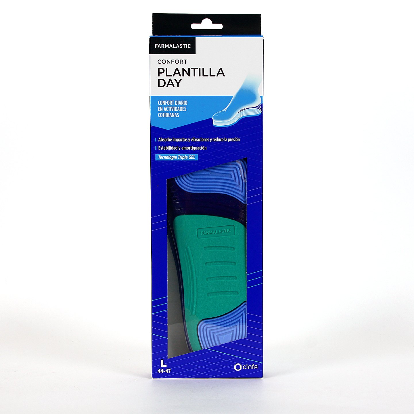 Farmalastic DAY Plantillas Actividad Diaria es un producto de cuidado para tus pies que amortigua los impactos de manera eficaz, ayudando a reducir la presión a la que están sometidos a diario. Su tecnología y diseño proporcionan una correcta actividad y soporte en el arco plantar, así como una correcta amortiguación en el metatarso, así como en la zona del talón. Este producto es ideal para utilizar en las actividades cotidianas, como caminar, pudiéndose utilizar en el calzado habitual. La talla L corresponde a los números 44-47.