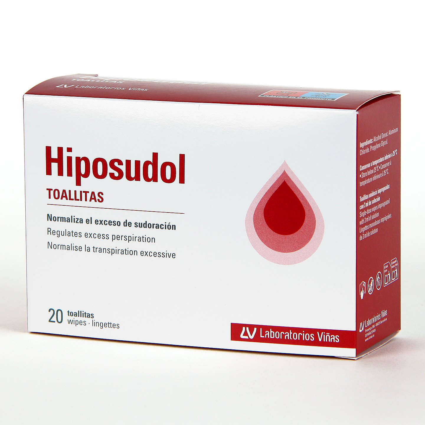 Hiposudol toallitas unidosis, impregnadas con una solución alcohólica de aluminio hexahidrato al 20% para regular la transpiración excesiva de sudor y reducir el mal olor en la zona de las axilas, manos y pies. Su uso también está recomendado para evitar la sudoración excesiva que favorece la persistencia de infecciones, reduciendo así la aparición de recidivas.