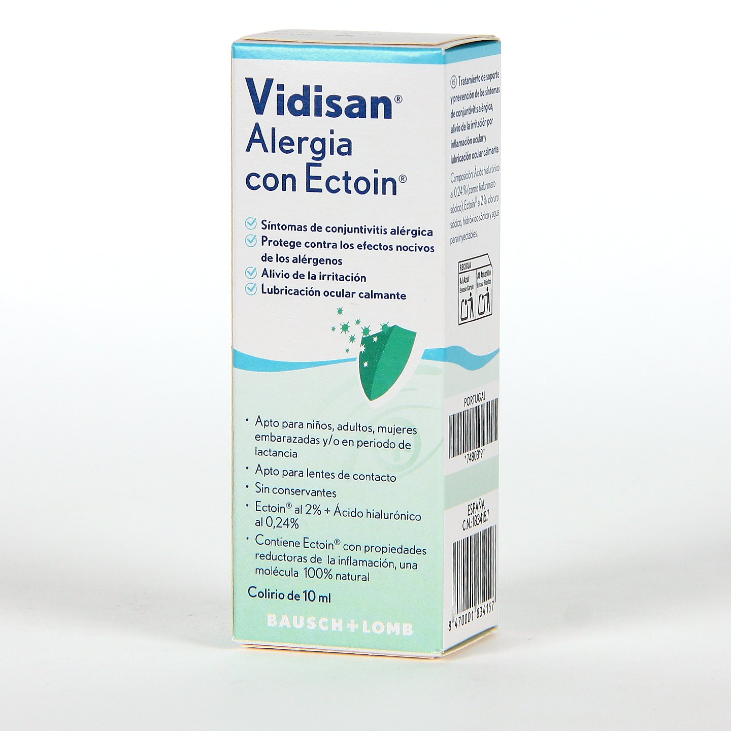 Vidisan Alergia con Ectoin Colirio es una solución isotónica, rica en Ectoin, con propiedades reductoras de la inflamación y estabilizadoras de las membranas, que ayuda a prevenir los síntomas de la conjuntivitis alérgica, alivio de ojos irritados y favoreciendo la lubricación ocular.