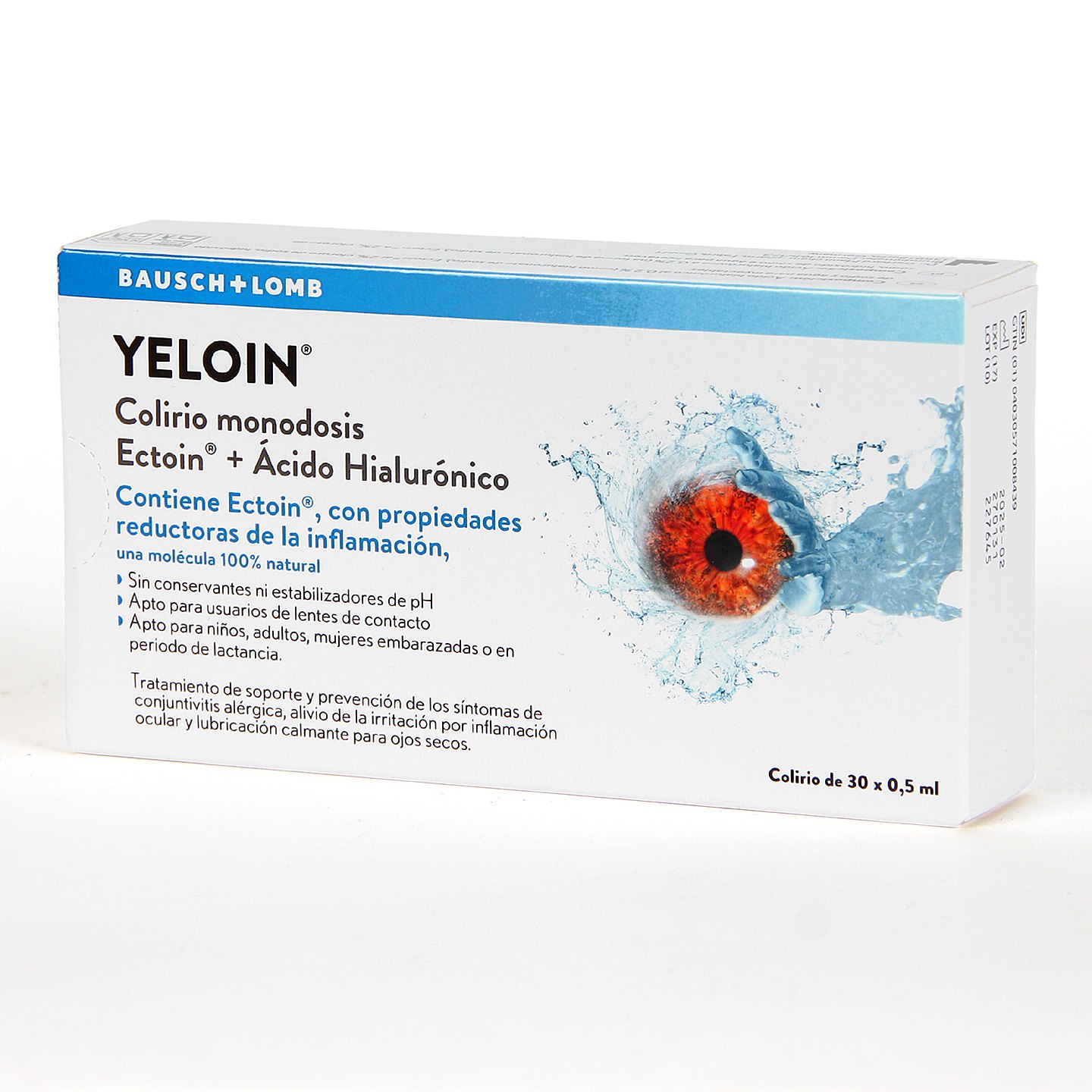Yeloin Colirio Monodosis es una solución oftálmica isotónica que alivia las irritaciones, enrojecimiento, picor y lagrimeo ocular al lubricar de manera intensa la superficie ocular, proporcionando una sensación de confort y bienestar. Posee una rica formulación, entre la que destaca el ácido hialurónico con propiedades calmantes y estabilizadoras, así como Ectoin, una molécula natural que protege las células reductoras de la inflamación en la conjuntiva.