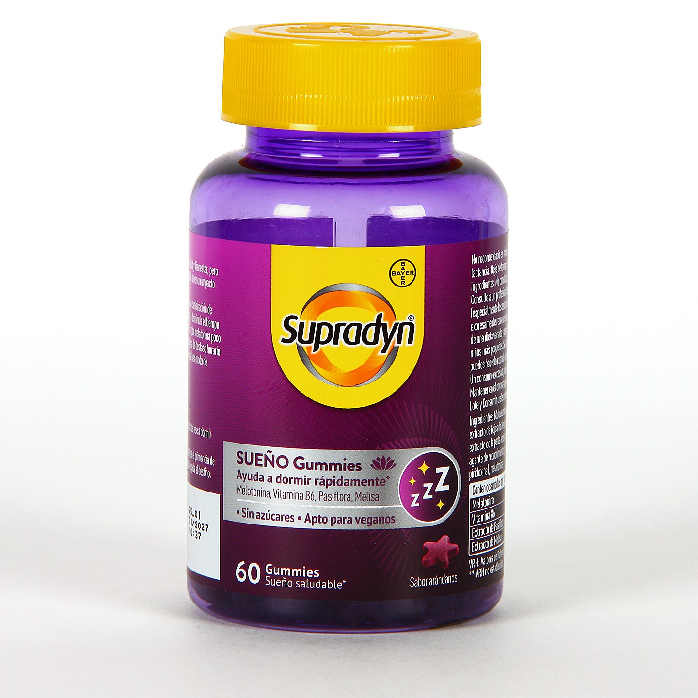 Supradyn Sueño Gummies 60 gominolas es un complemento alimenticio que contiene 1mg de melatonina que contribuye a disminuir el tiempo necesario para conciliar el sueño, Vitamina B6 que contribuye a la función psicológica normal y combina extracto de Melisa y Pasiflora de origen natural que ayuda a mejorar la calidad del sueño. Delicioso sabor a arándanos.