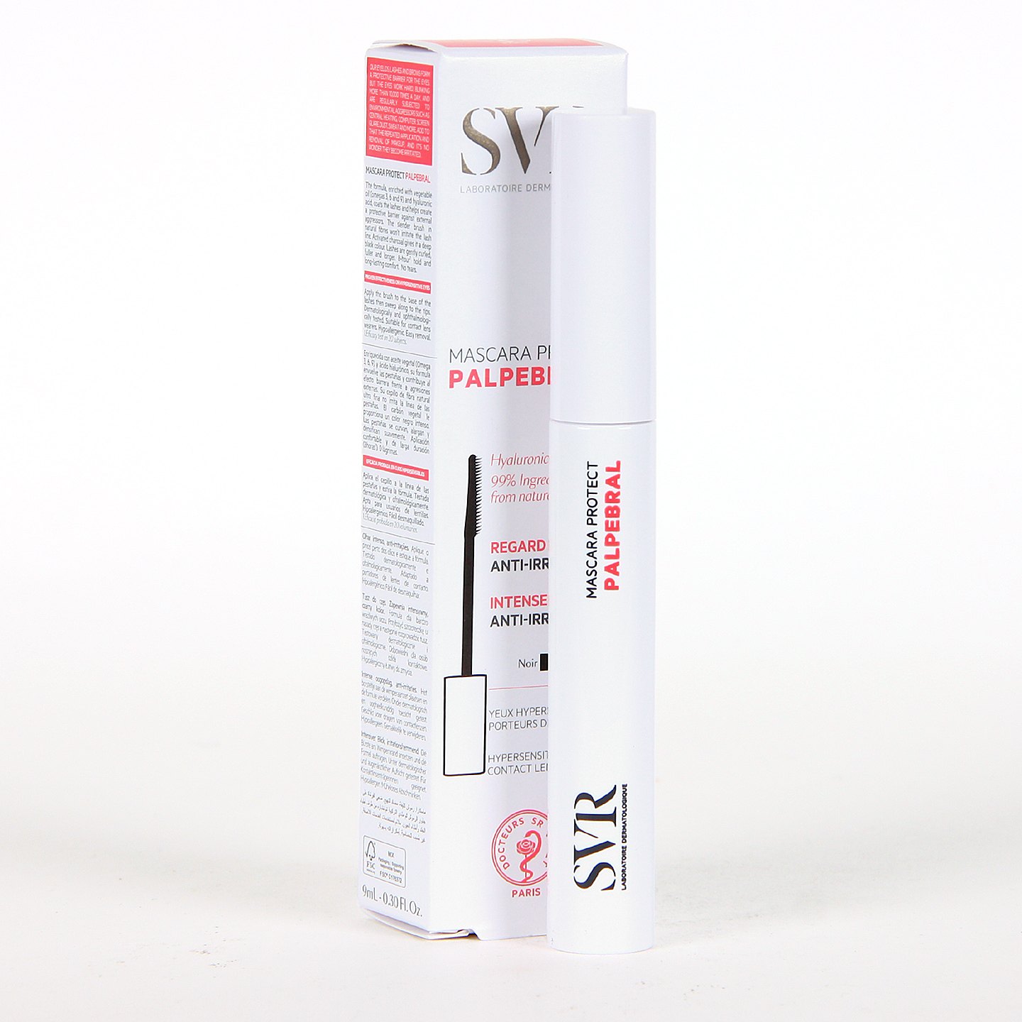 SVR Palpebral Máscara Protect by Topialyse, es una mascara de pestañas con un 99,7% de ingredientes de origen natural. Con una composición minimalista y, un suave y flexible cepillo natural con fibras de ricino que evitan la irritación del párpado y la línea de las pestañas al mismo tiempo que permite una aplicación fácil, delicada, precisa y sin grumos. Proporciona unas pestañas más largas, voluminosas y rizadas. Sus pigmentos negros intensifican la mirada. Su contenido en acido hialurónico fortalece y protege las pestañas. Fácil de desmaquillar. Sin perfume.