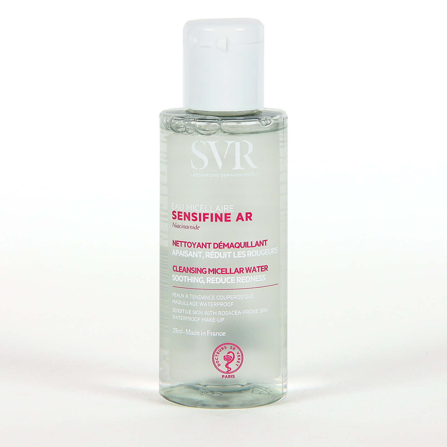 SVR Sensifine AR Agua Micelar, ahora en formato viaje de 75 ml, es un producto de limpieza para todo tipo de pieles, en especial para pieles sensible y reactivas con tendencia a rojeces y cuperosis. Limpia y desmaquilla de manera suave, eliminando toda la suciedad e impurezas de rostro, ojos y labios. Su acción calmante e hidratante consigue calmar y aliviar la sensación de tirantez y calor en las pieles con rojeces, para una piel fresca y confortable.