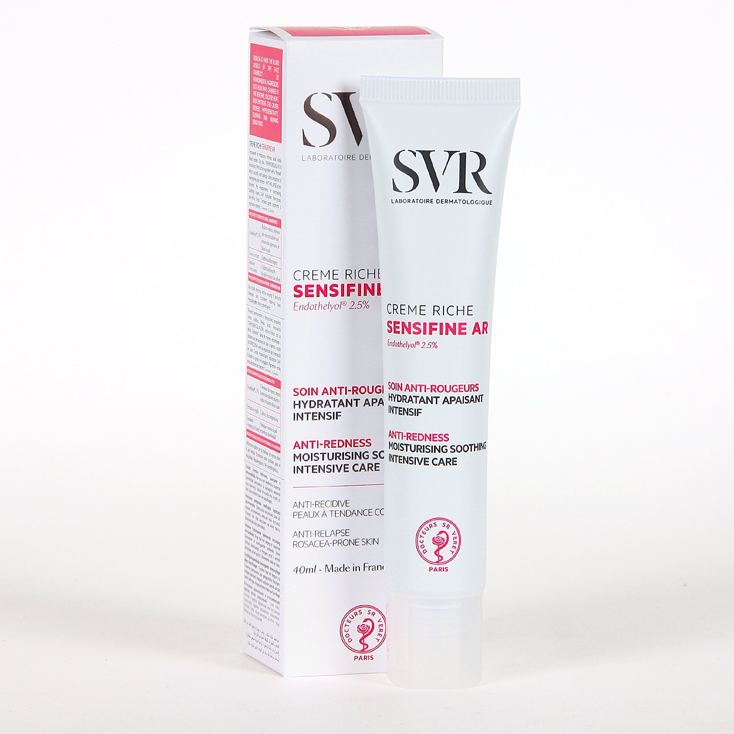 SVR Sensifine AR Crema Rica es un producto de cuidado con acción intensiva hidratante y calmante para las pieles sensibles y reactivas que sufren rojeces y/o cuperosis. Su composición consigue un efecto termorregulador que ayuda a controlar el aumento de temperatura del rostro, previniendo y controlando el enrojecimiento de la piel. Además, contiene pigmentos verdes para atenuar y disimular las rojeces, permitiendo que el rostro luzca de manera más uniforme.