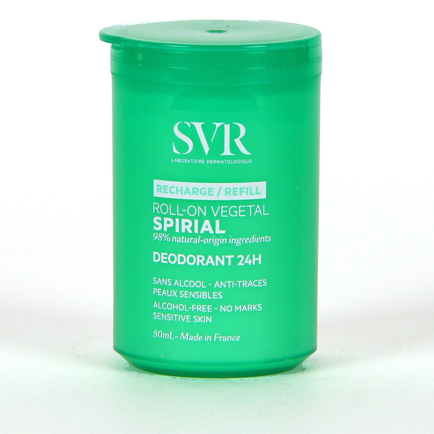 SVR Spirial Roll-on Vegetal Recarga, envase eco friendly a un precio más económico, es un desodorante antitranspirante en formato roll on, con una estricta formulación vegana, adaptada para una axilas sensibles o recién depilada. Absorbe la humedad y combate los malos olores de forma duradera, reduciendo la sudoración de los poros, gracias a su rica formulación con extracto de cola de caballo, bambú y salvia, que además previenen y evitan el mal olor con sus propiedades antibacterianas evitan el mal olor. Este desodorante no contiene sales de aluminio y ofrece un acabado seco y sin manchas.