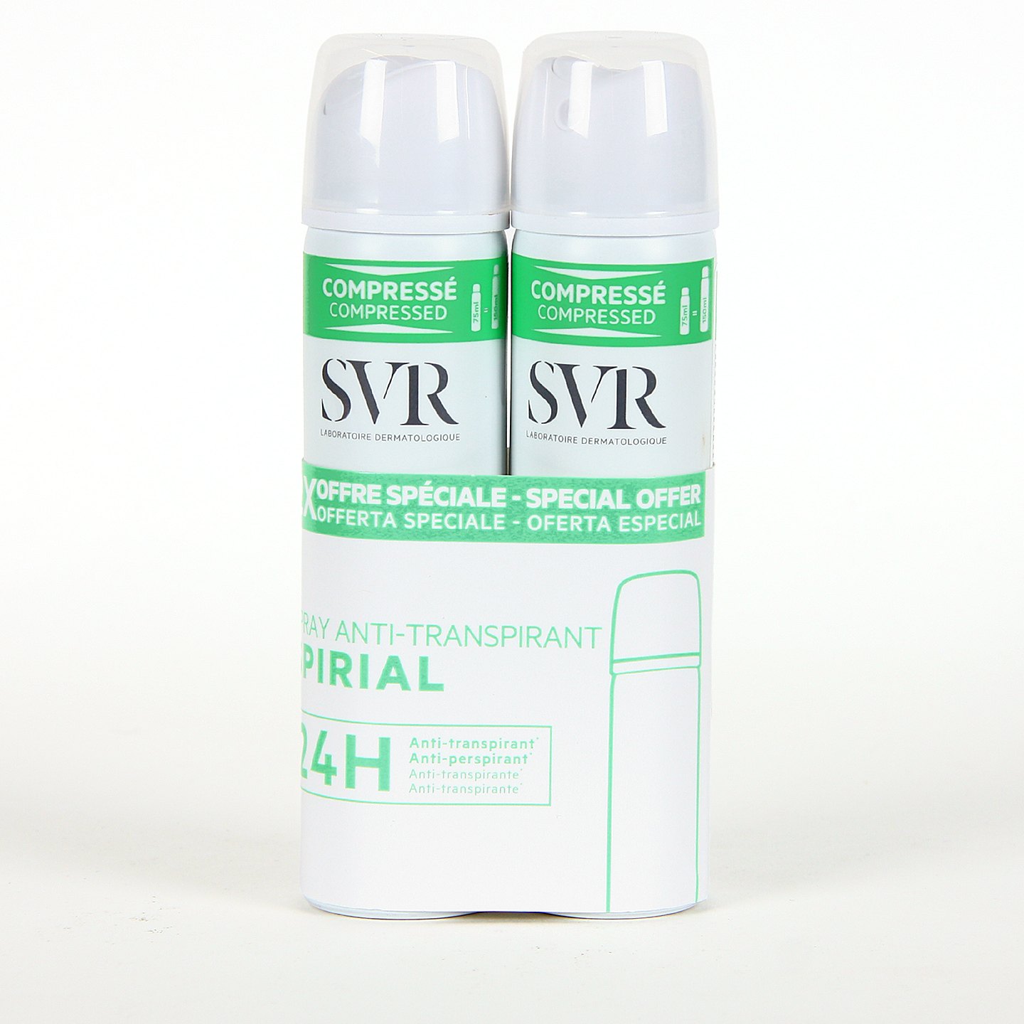 Pack Duplo SVR Spirial Spray es un desodorante anti-transpirante intensivo de alta tolerancia para aplicar en axilas, manos y pies. Eficaz contra la sudoración hasta 48 horas, incluso en caso de transpiración intensa (deporte, estrés...). Desodorante unisex con activos reguladores del sudor que controlan la transpiración, absorben la humedad y combaten los malos olores. Formato comprimido ideal para llevar en el bolso o en el equipaje de mano durante tu vuelo. Pack con dos unidades de SVR Spirial Spray 75ml.