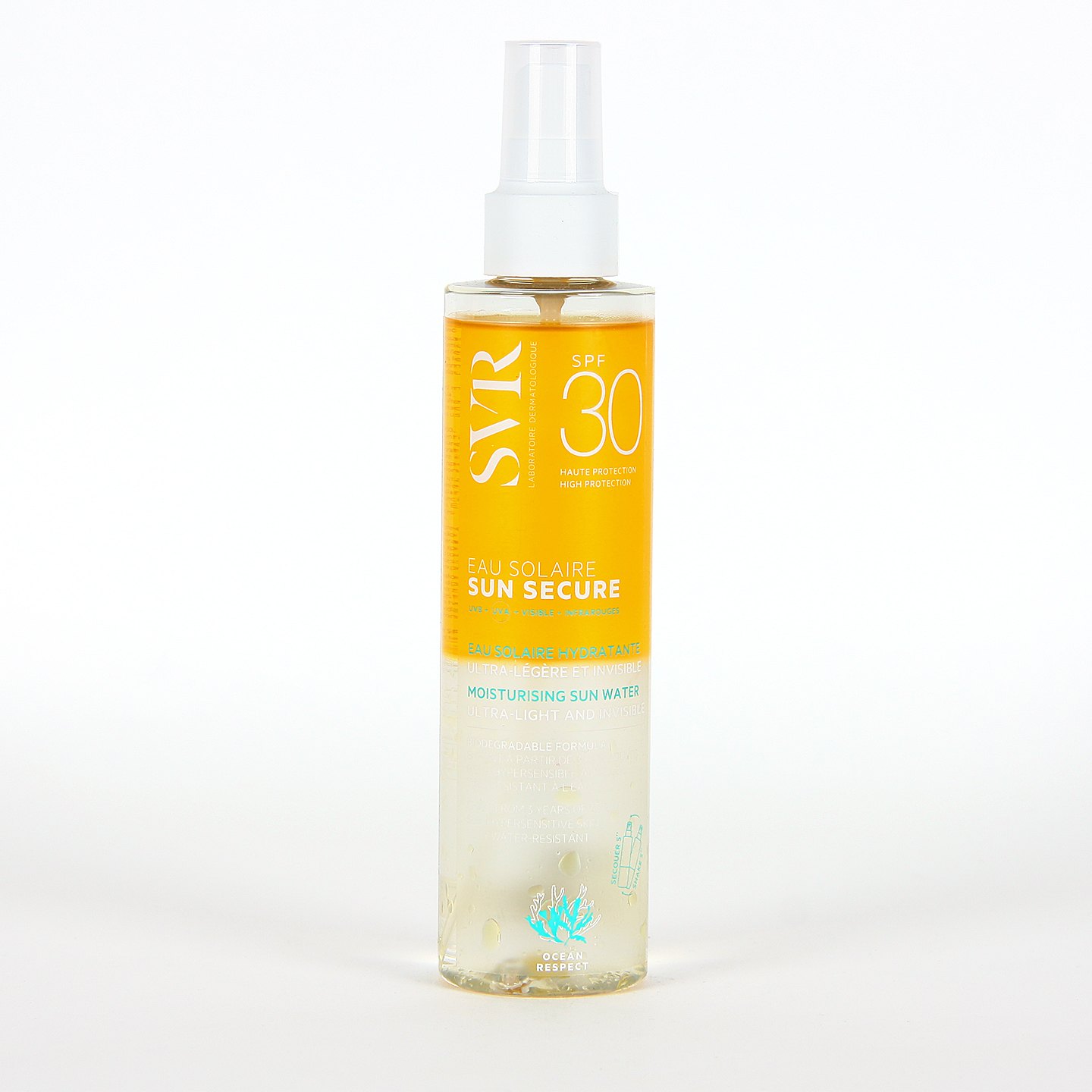 SVR Sun Secure Agua Solar SPF30 es un protector corporal en textura agua bifásica fresca, ultraligera e invisible combinada con una protección dermatológica alta. Fórmula biodegradable para proteger el medio marino y especies esenciales para su desarrollo. Formato spray, muy resistente al agua, resistente al roce y con acabado transparente.