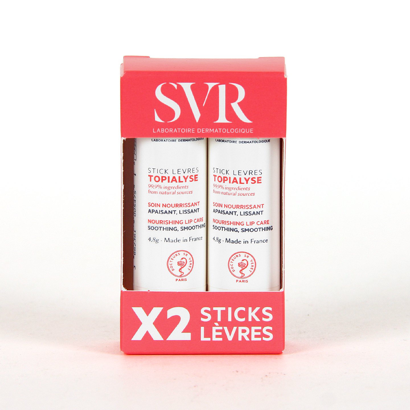 SVR Topialyse Stick Labios Pack Duplo cuida los labios sensibles, dañados y deshidratados. Aporta confort duradero gracias a su fórmula de alta tolerancia enriquecida con omegas 3, 6 y 9. Calman e hidratan los labios durante seis horas. La textura fundente se desliza dejando una película completamente invisible y no pegajosa que protege contra agresores externos. Contiene 12 ingredientes y la fórmula es 99,9% de origen natural.