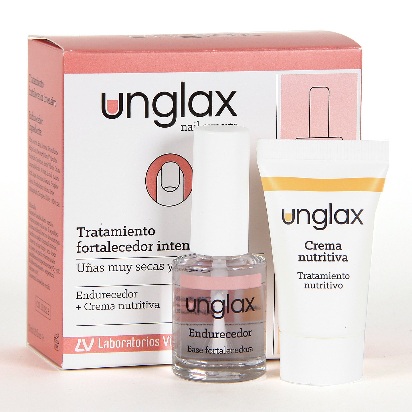 Unglax Tratamiento Fortalecedor Intensivo para uñas muy secas y frágiles que necesitan un cuidado extra que favorezca su endurecimiento, evitando así su debilitamiento y que se partan con facilidad. Este cuidado combina dos productos que al utilizarlos de manera conjunta potencian la resistencia y protección, evitando la rotura de las uñas.