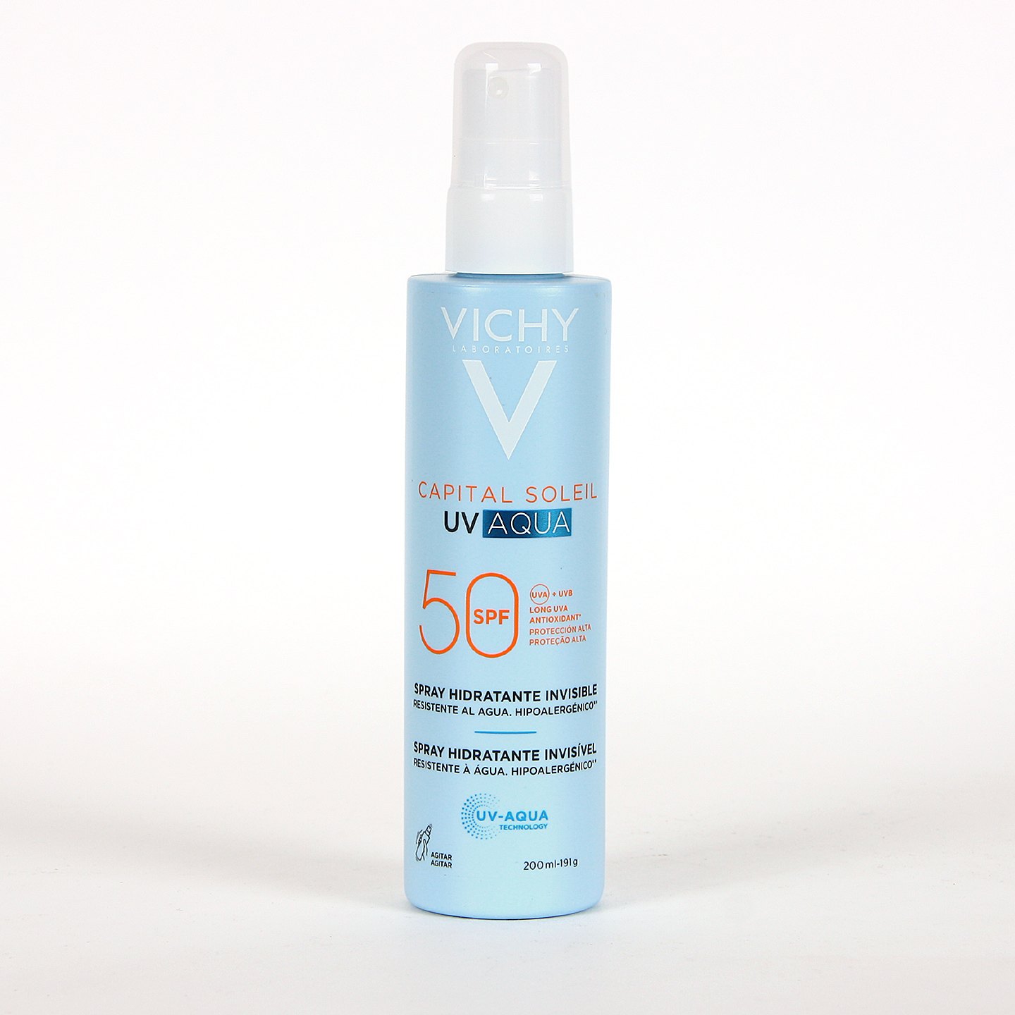Vichy Capital Soleil UV Aqua Spray SPF 50 200 ml es un protector solar corporal en spray con textura ultraligera tipo agua que proporciona alta protección frente a la radiación solar, mientras hidrata y refresca la piel.