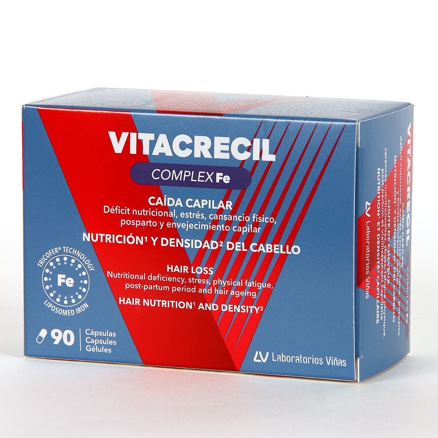 Vitacrecil Complex Forte FE cápsulas es un complemento alimenticio capilar que favorece el crecimiento del cabello sano y con vitalidad, frenando a su vez la caída de cabellos finos y desnutridos ante un déficit de hierro como pueden ser deportistas de alto rendimiento, para mujeres en lactancia materna tras el parto o ante menstruaciones abundantes, etapa de la perimenopausia o ante la toma de medicamentos que reducen el hierro. Estas cápsulas anticaída aportan un extra de hierro y otros nutrientes para conseguir un cabello más fuerte, denso y sano.