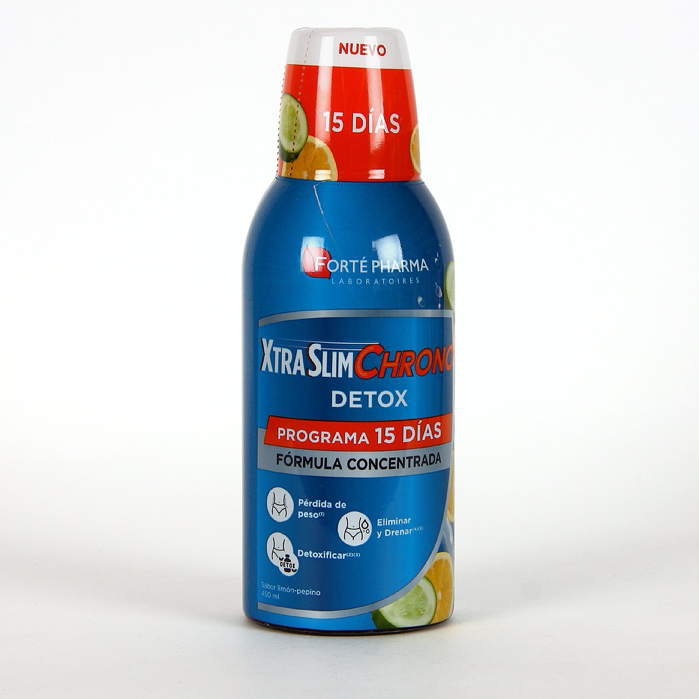 La retención de líquidos, la sensación de hinchazón y la acumulación de toxinas pueden dificultar la pérdida de peso y provocar malestar general. Xtraslim Chrono Detox 450 ml ha sido formulado como un complemento depurativo y drenante que ayuda a preparar el organismo antes de iniciar un programa de adelgazamiento o como apoyo durante el mismo. Su fórmula líquida combina extractos vegetales favorece la eliminación de líquidos y toxinas acumuladas. El formato bebible facilita la absorción y resulta cómodo para quienes prefieren alternativas a las cápsulas.