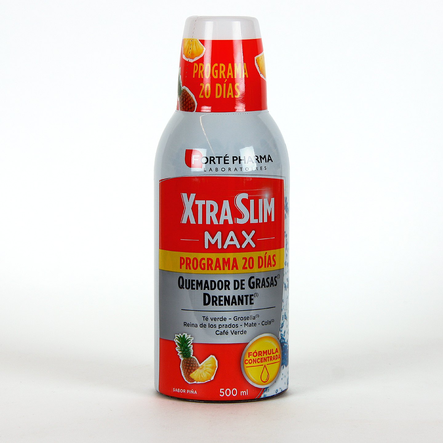 Xtraslim Max 500 ml sabor piña es un complemento alimenticio líquido formulado para apoyar los programas de control de peso gracias a su combinación de extractos vegetales con acción drenante y favorecedora del metabolismo de las grasas. Su fórmula combina plantas como té verde, mate, reina de los prados, hibisco, café verde y achicoria, junto con nuez de cola y grosella, que contribuyen a estimular la eliminación de líquidos y apoyar los procesos naturales del organismo dentro de un programa de adelgazamiento.