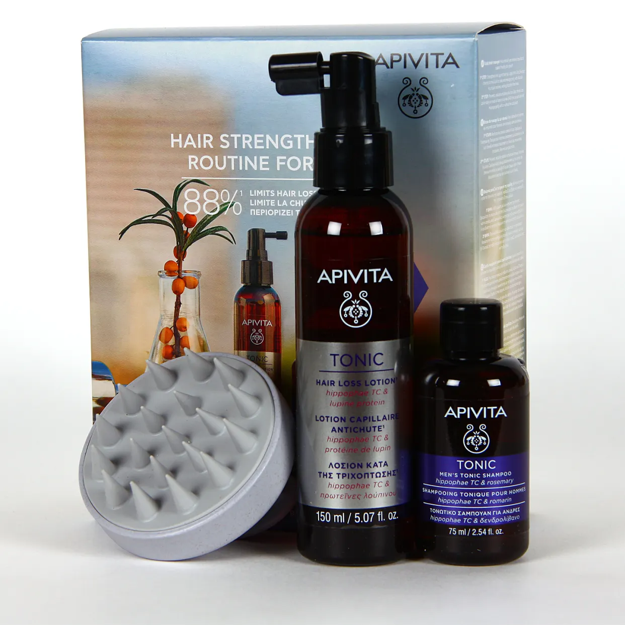 El Apivita Pack Loción Anticaída y Champú Tonificante para Hombre es una solución completa para fortalecer el cabello masculino desde la raíz. Combina una loción anticaída eficaz con un champú tonificante que limpia en profundidad, reactiva la microcirculación y aporta vigor a la fibra capilar. Incluye además un cepillo masajeador de regalo que estimula el cuero cabelludo y mejora la absorción de los activos. Ideal para hombres que buscan fortalecer, energizar y proteger su cabello, este pack aporta densidad y salud capilar, dejándolo más fuerte, con menos caídas y con una sensación de limpieza duradera.